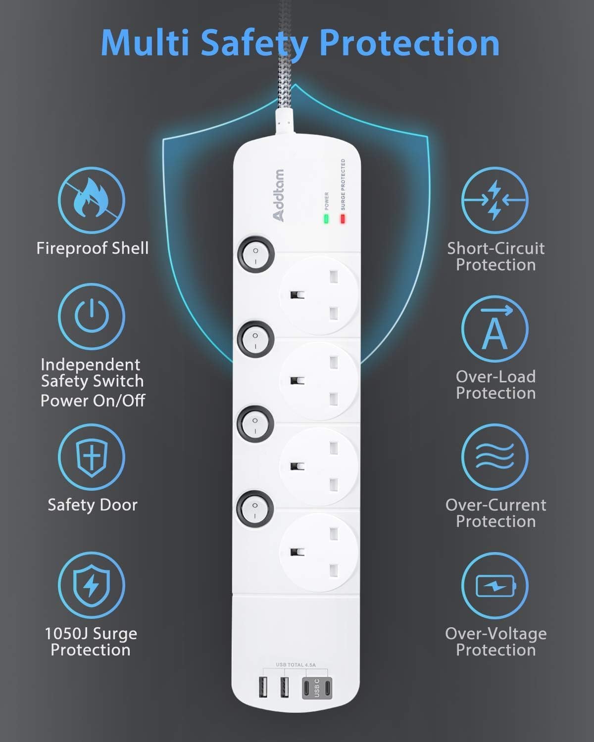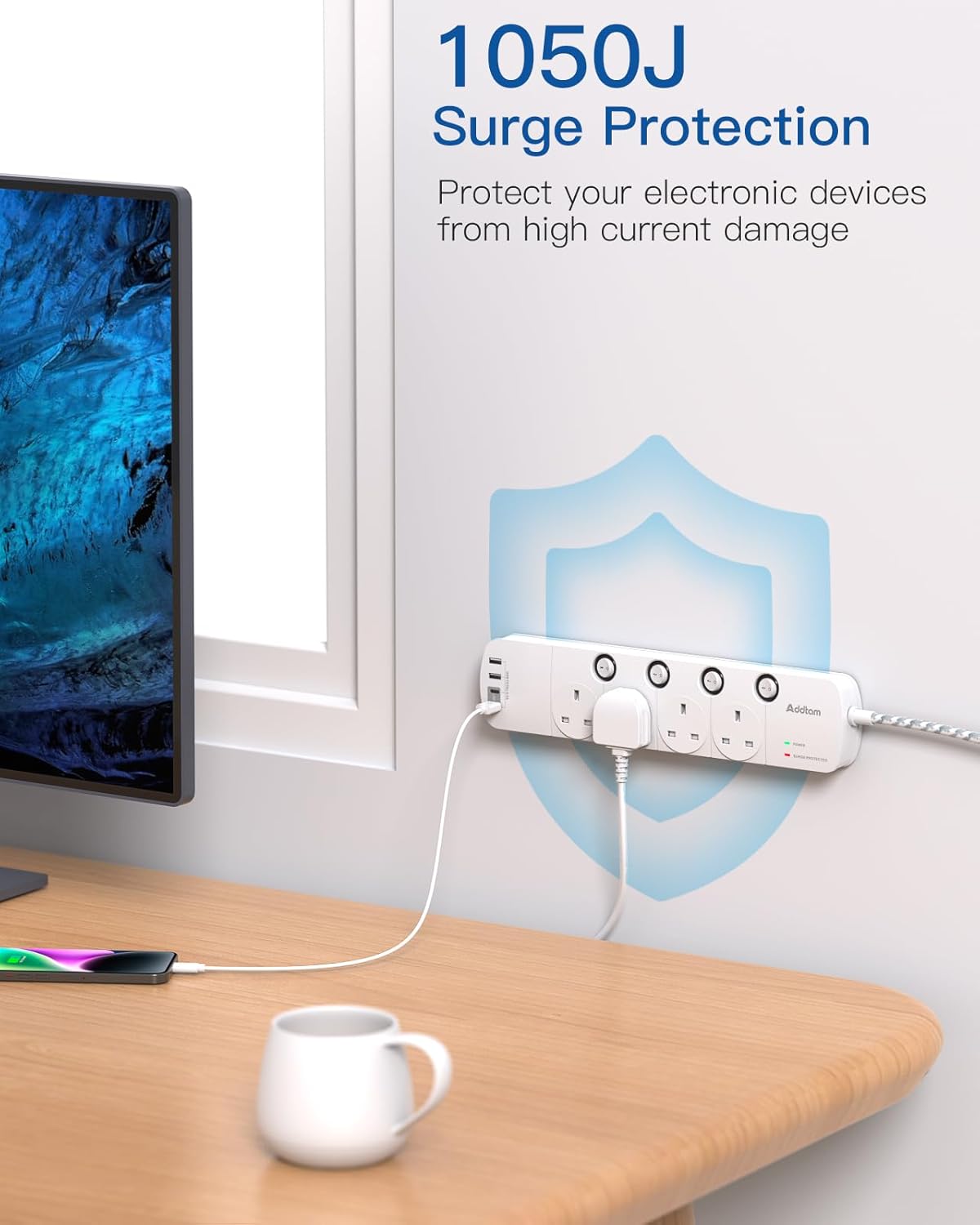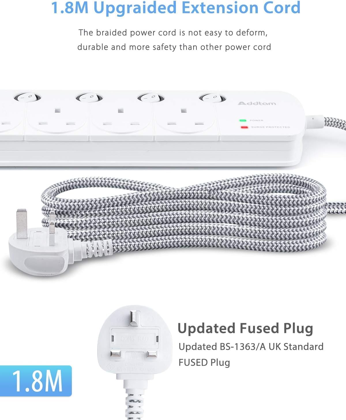 1.8M Extension Lead, 4 Way Socket Outlets Power Strips with 4 USB (2 Type C & 2 USB A), 1050J Surge Protection Multi Plug Extension with Braided Extension Cable for Home, Office, Individually Switched