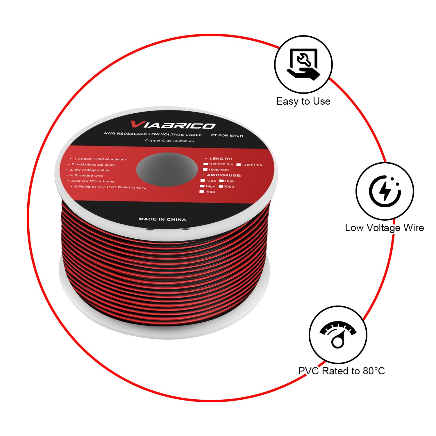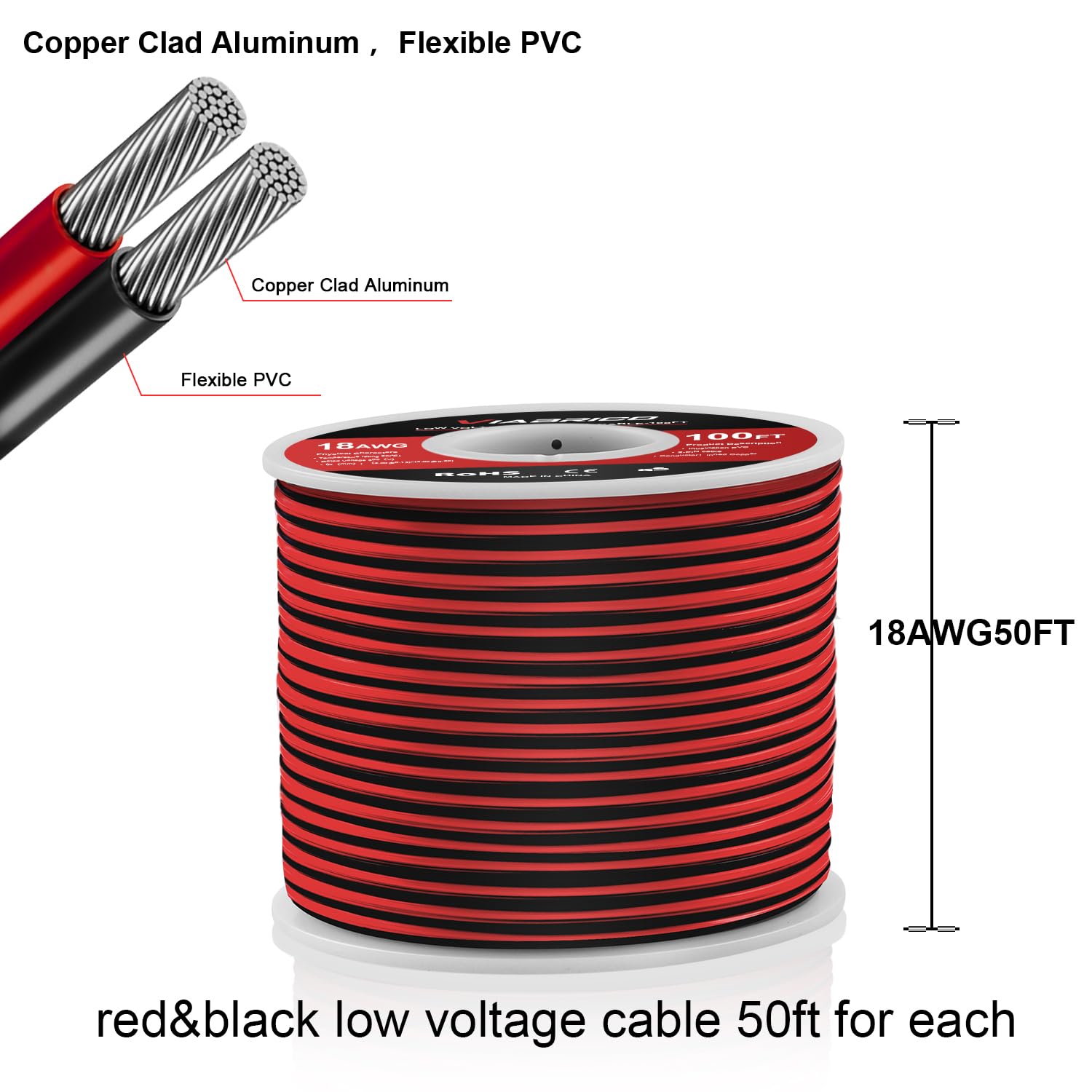 18AWG 50FT Electrical Wire 2 Conductors Red Black for LED Lighting Strips Flexible Extension Cord 18 Gauge Copper Clad Aluminum Wire 12V/24V DC