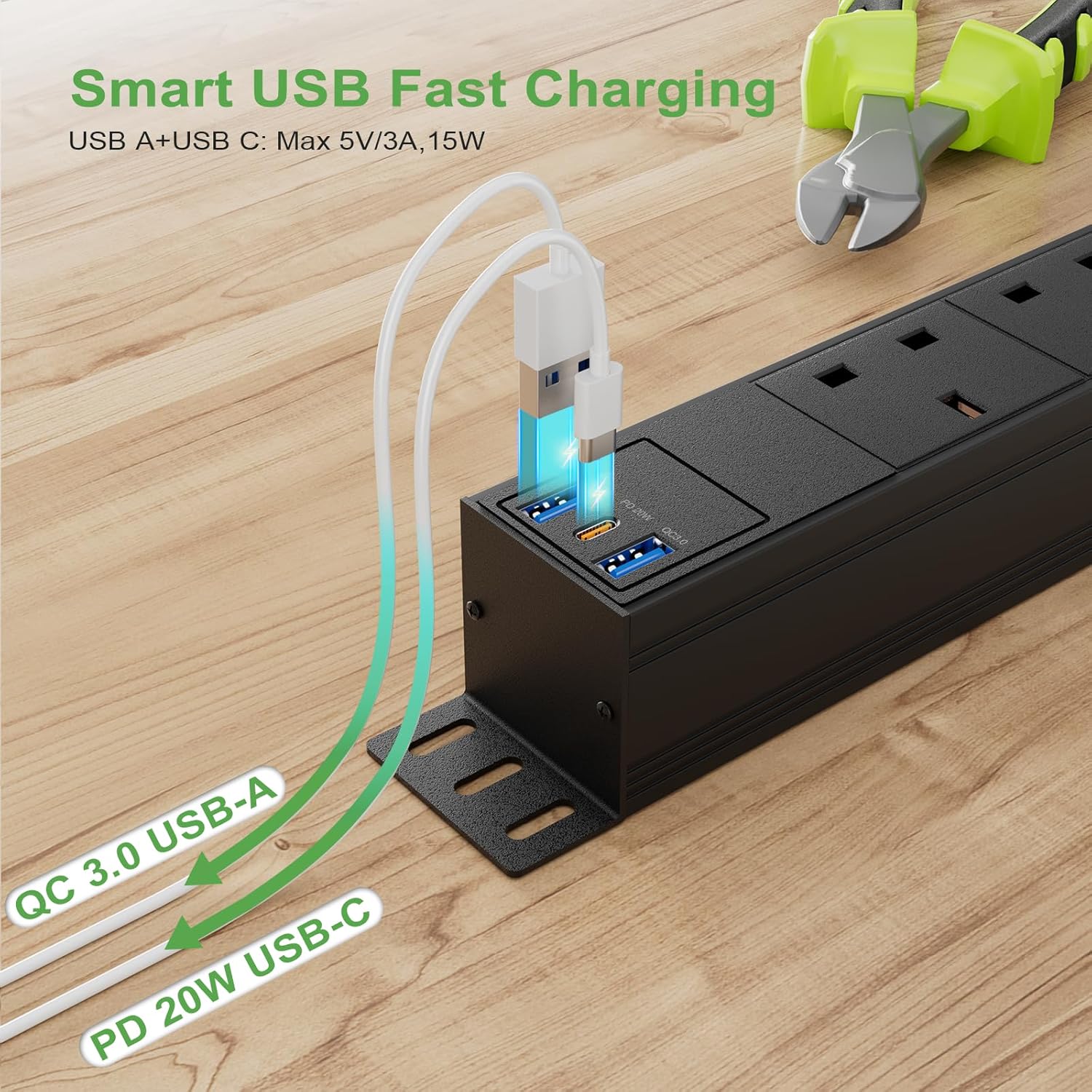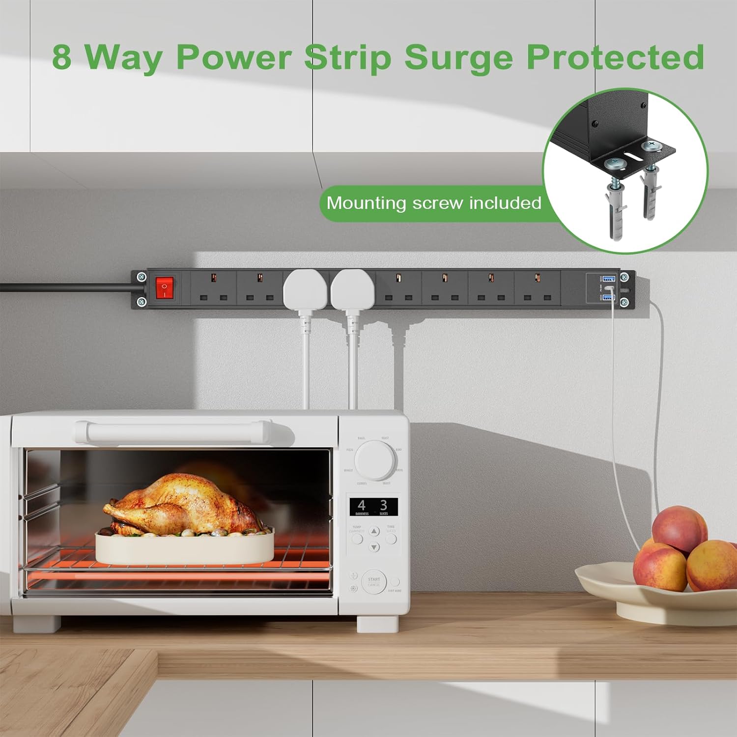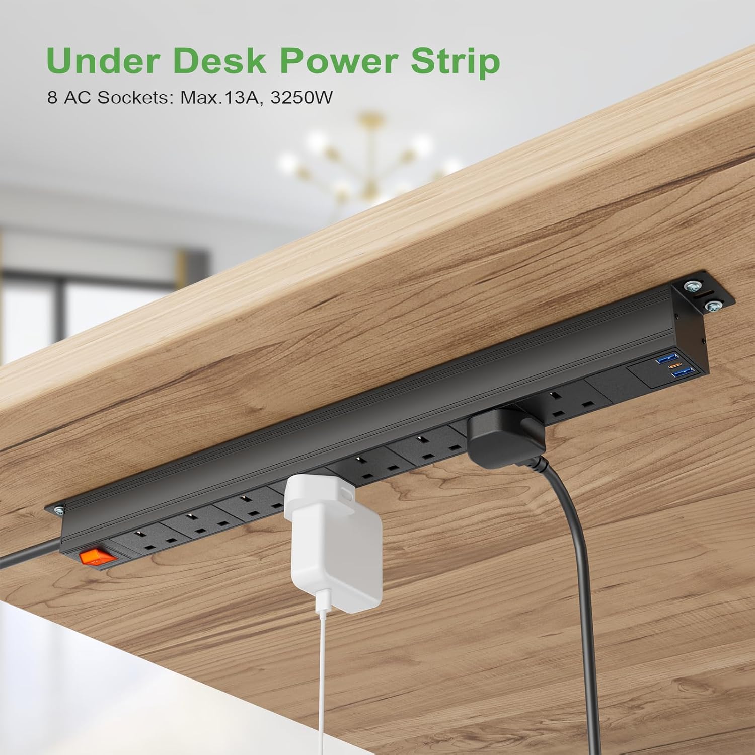 3m Cable 8 Way Power Strip Surge Protector, 8 Way Extension Lead USB C PD20W with Switches, Wall Mount Power Strip with Metal Casing for Home Office Industrial Use, Black, 13A