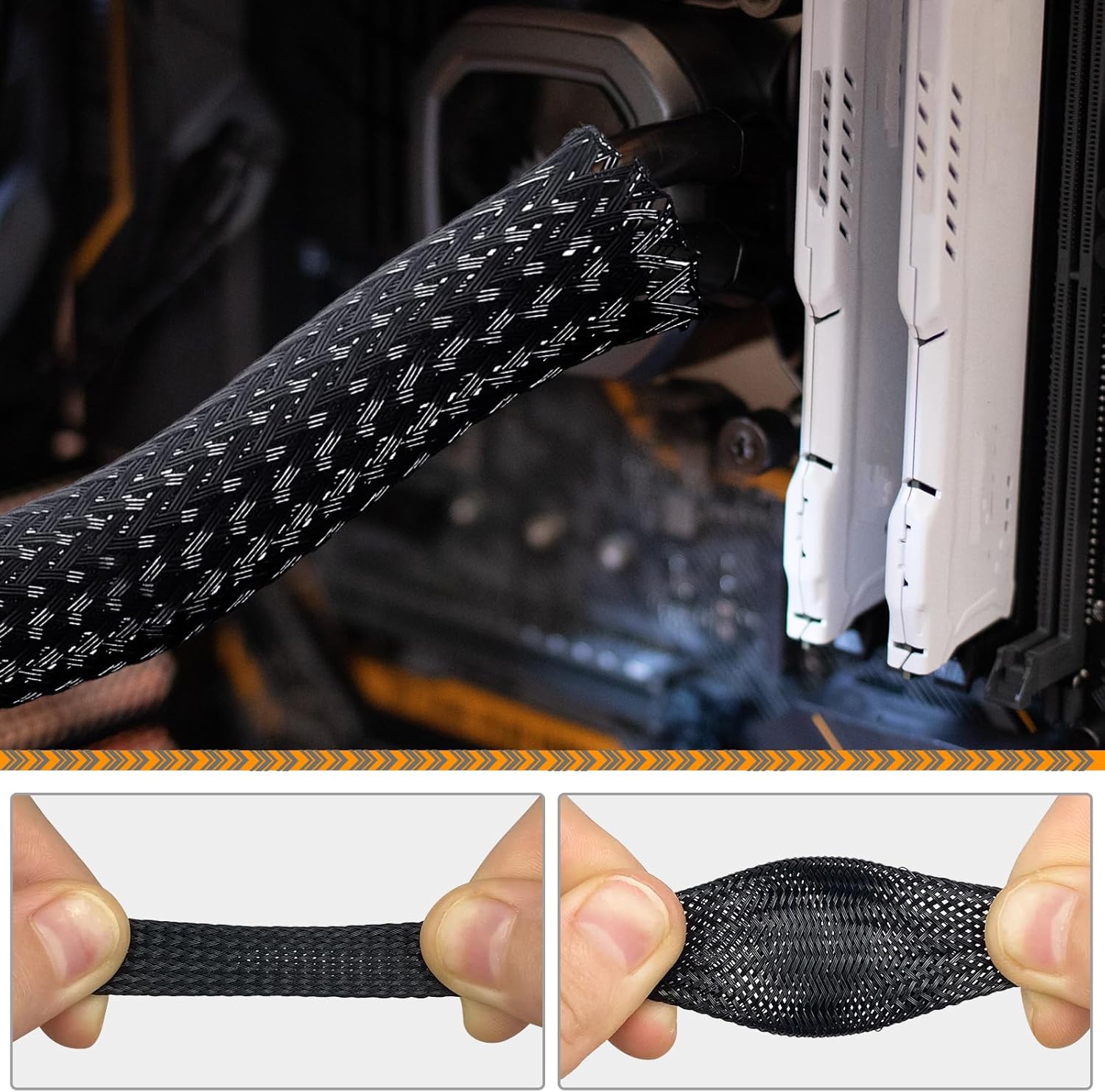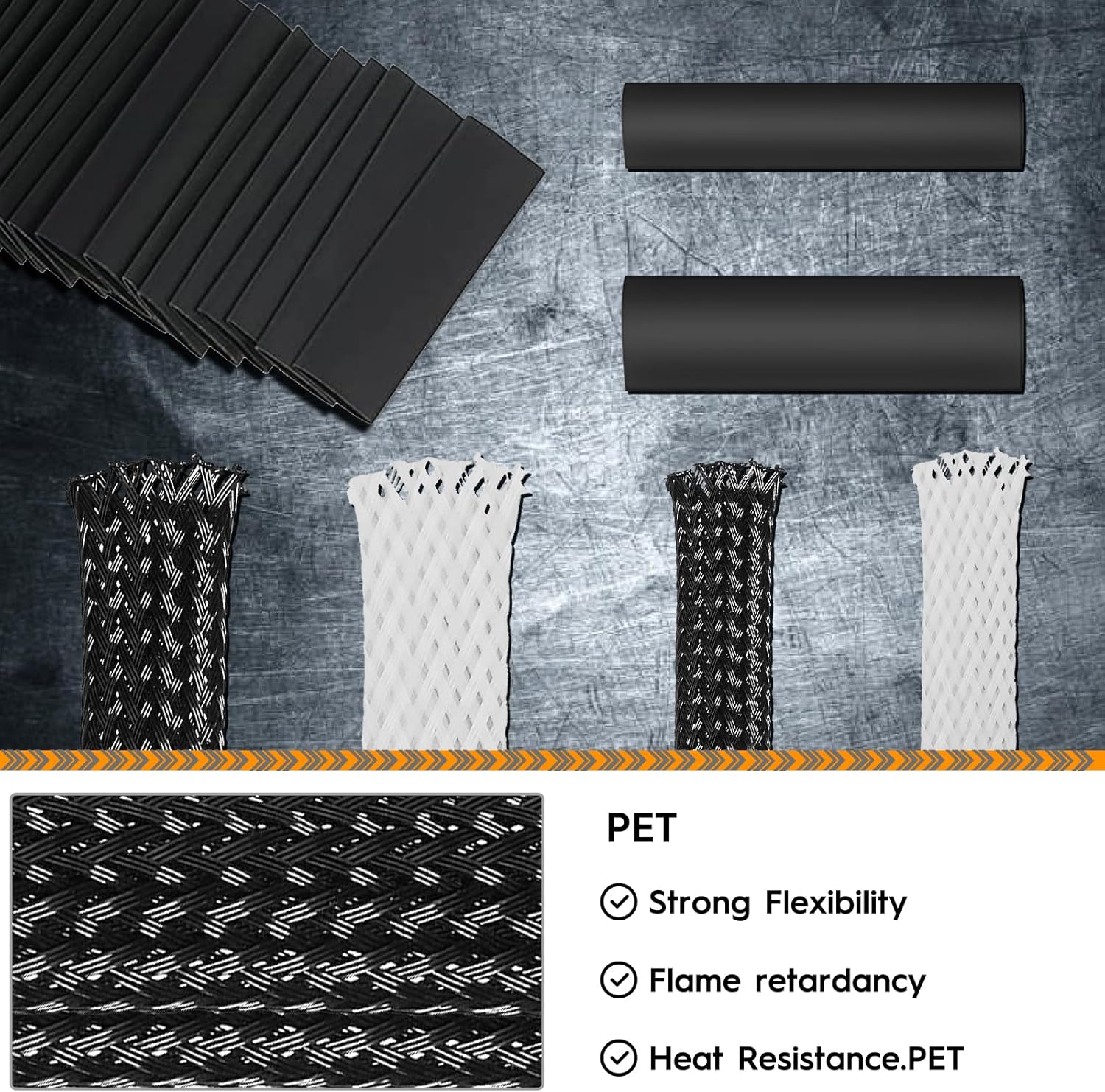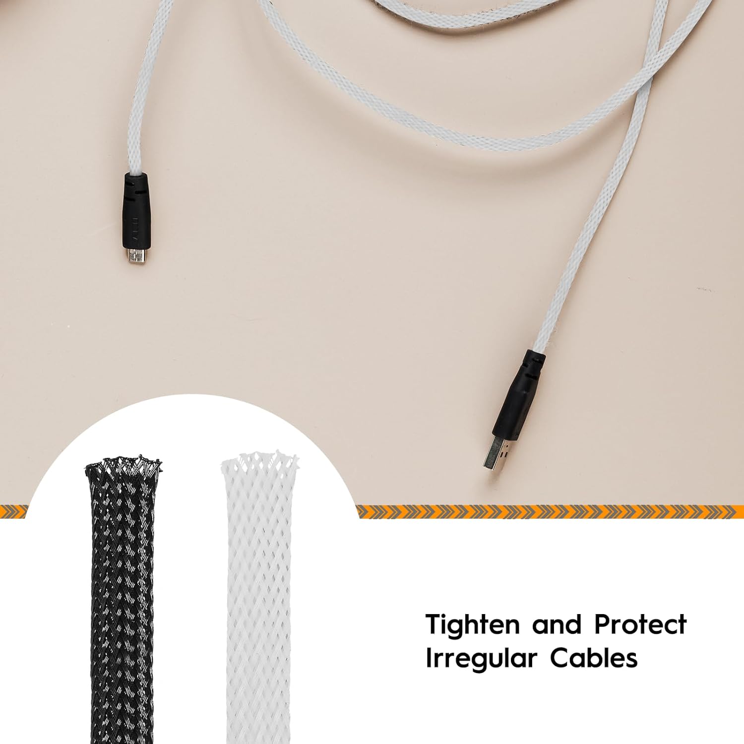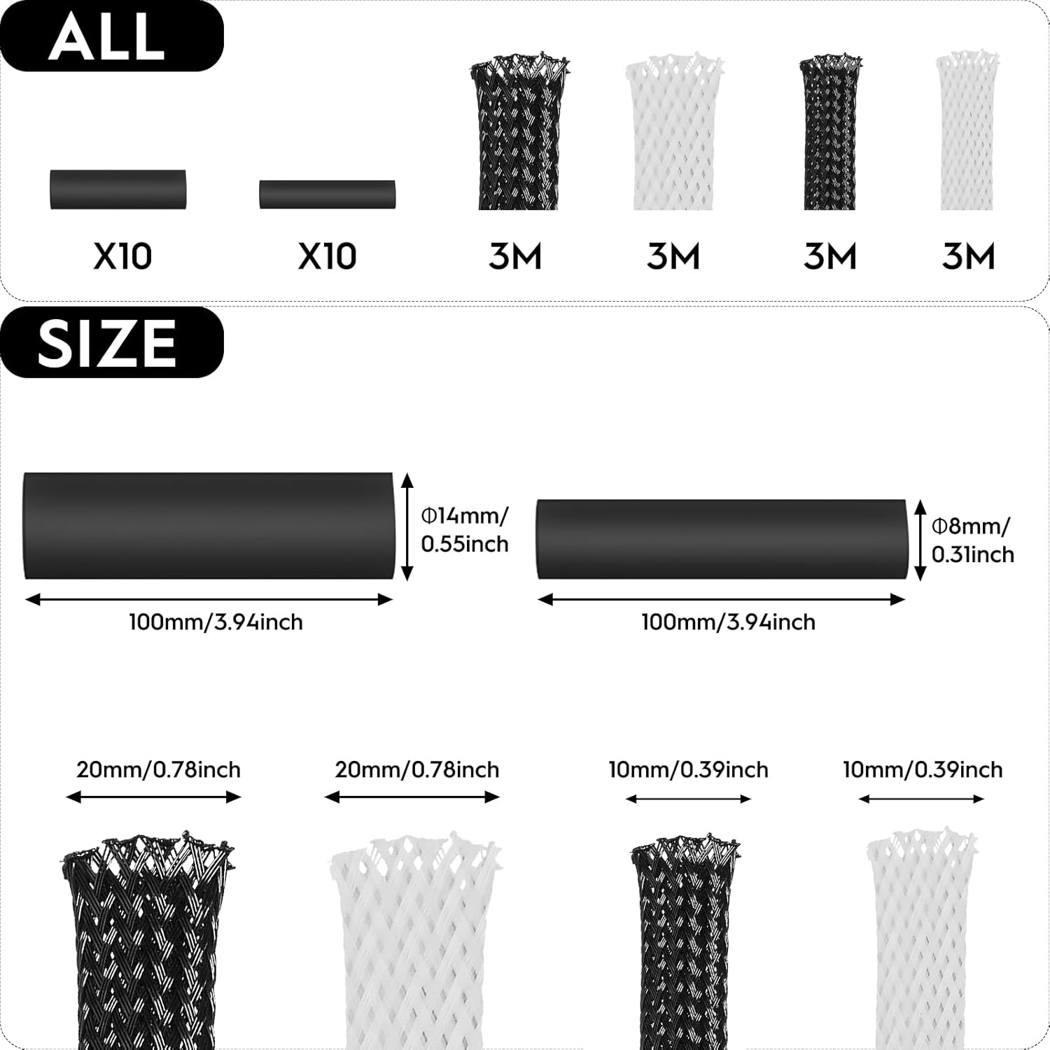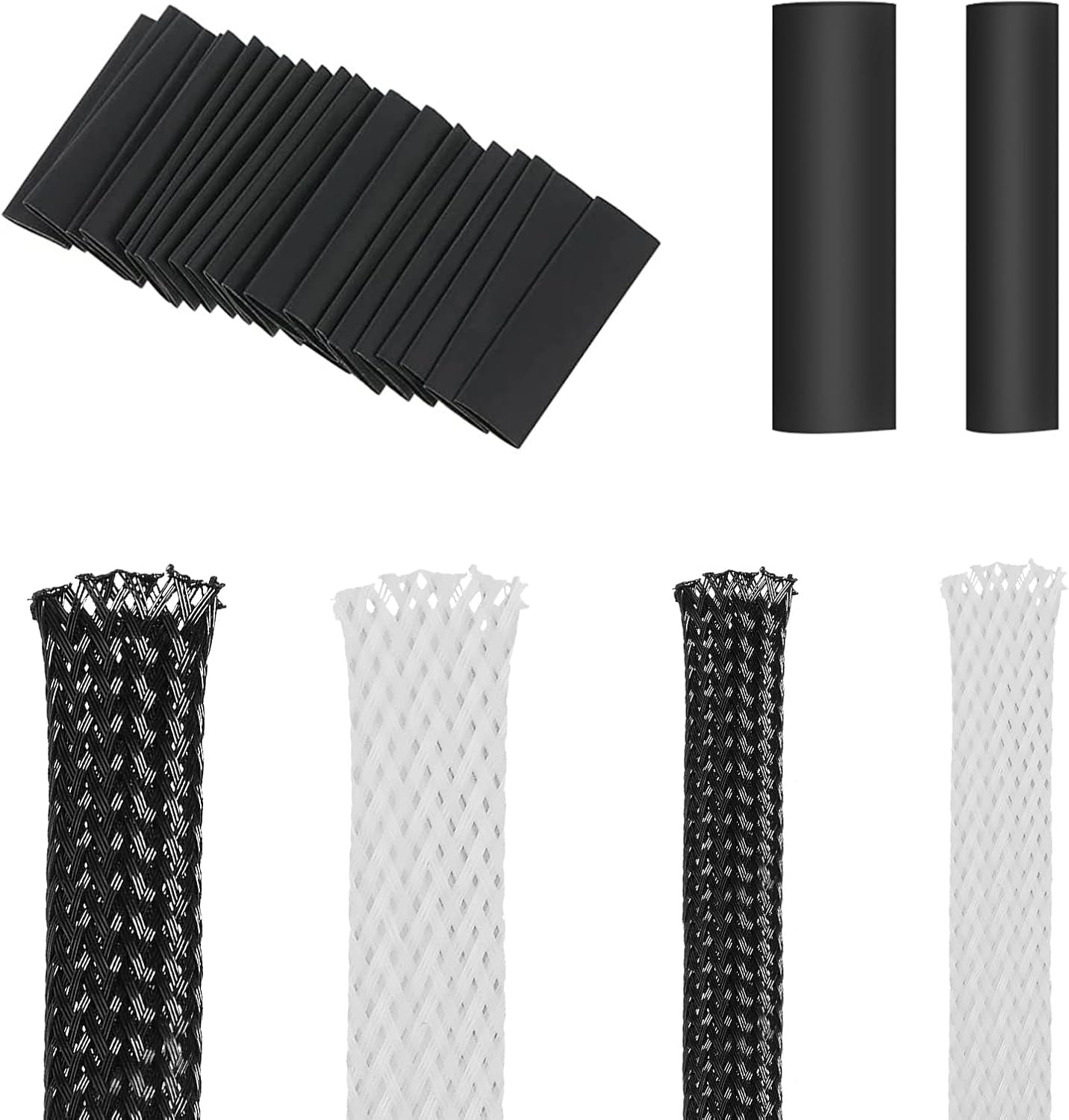 4roll 3m/roll PET Expandable Braided Cable Wire Sleeving 10/20mm Cable Wrap Snake Cord Protector for Audio Video Home Device Cable Automotive Wire(black,white)