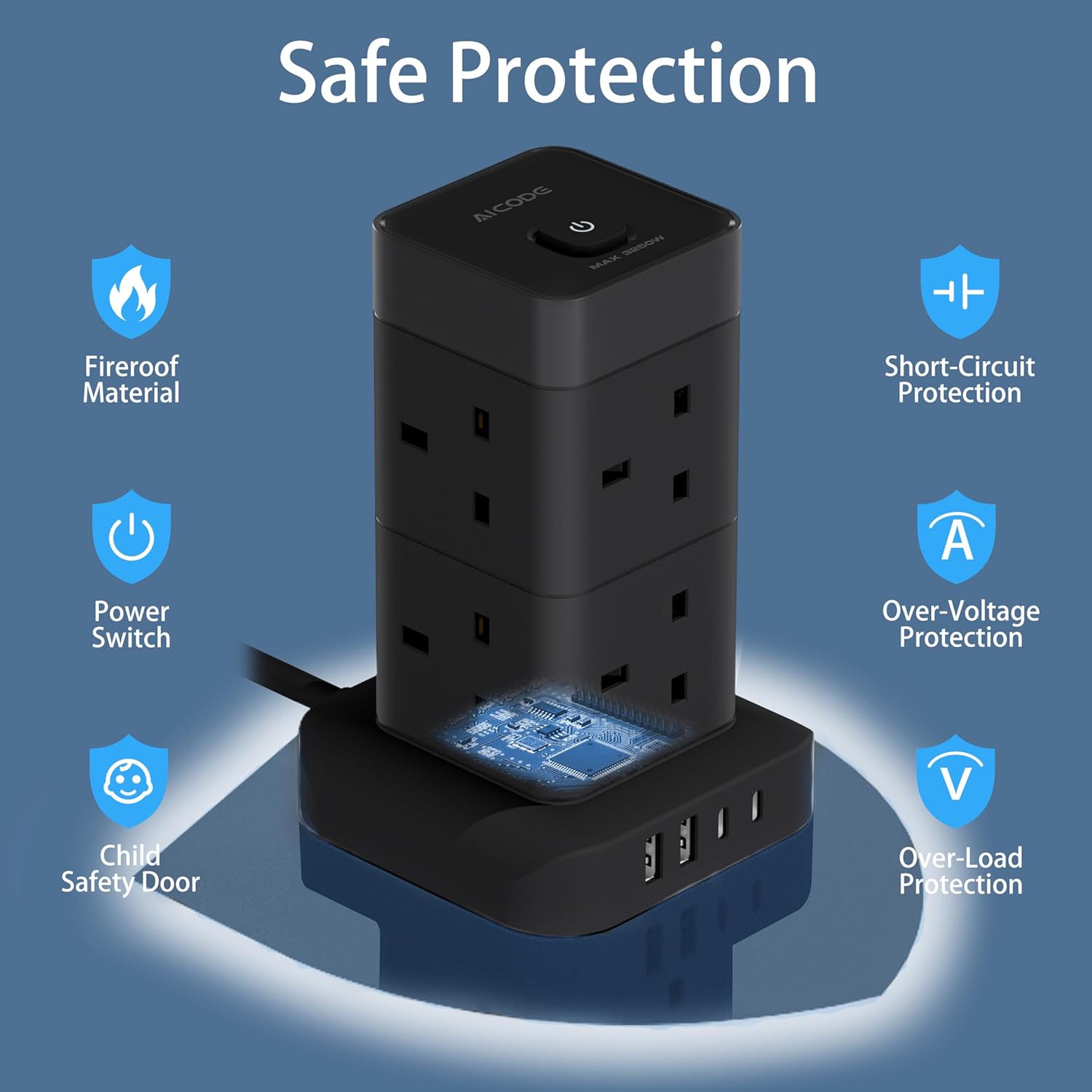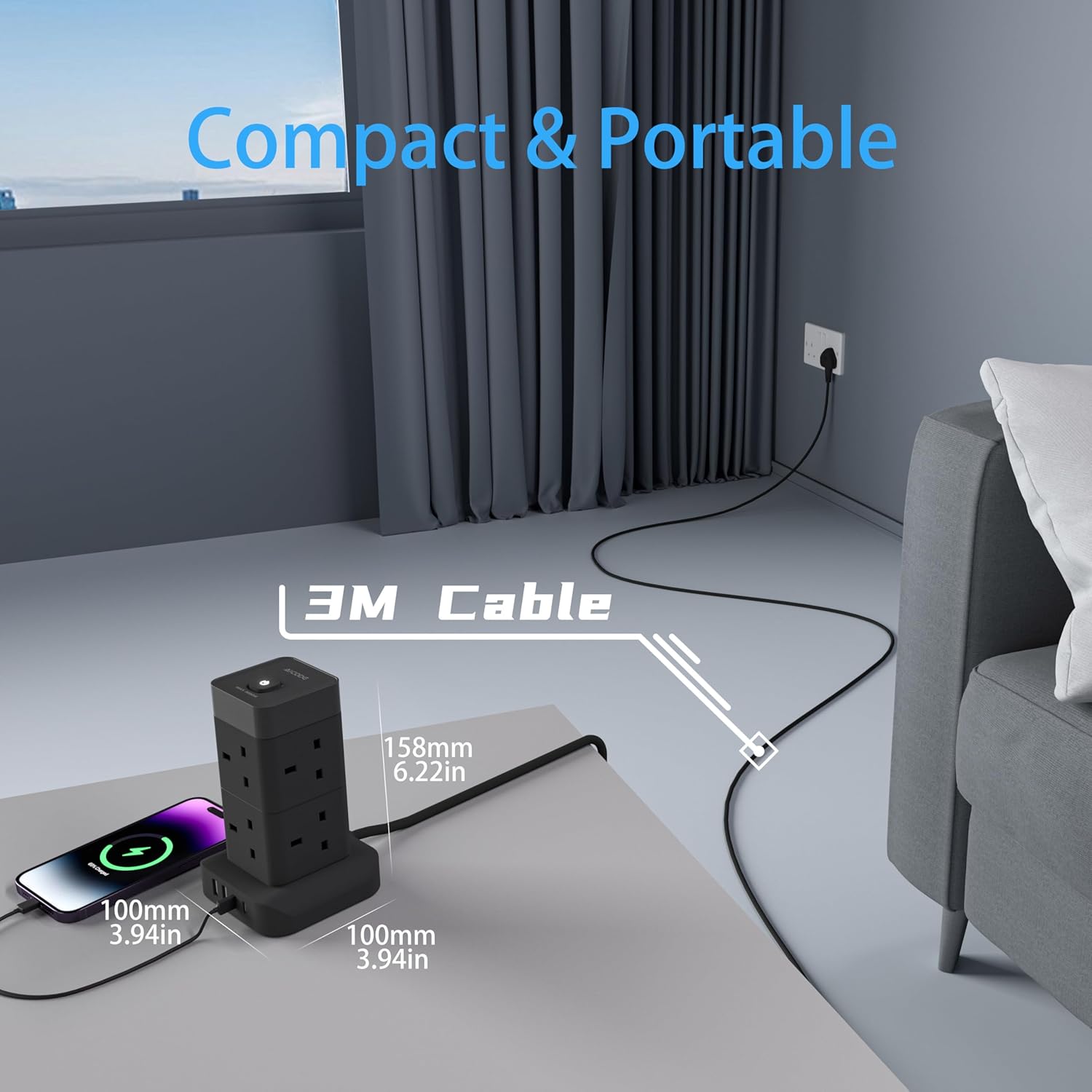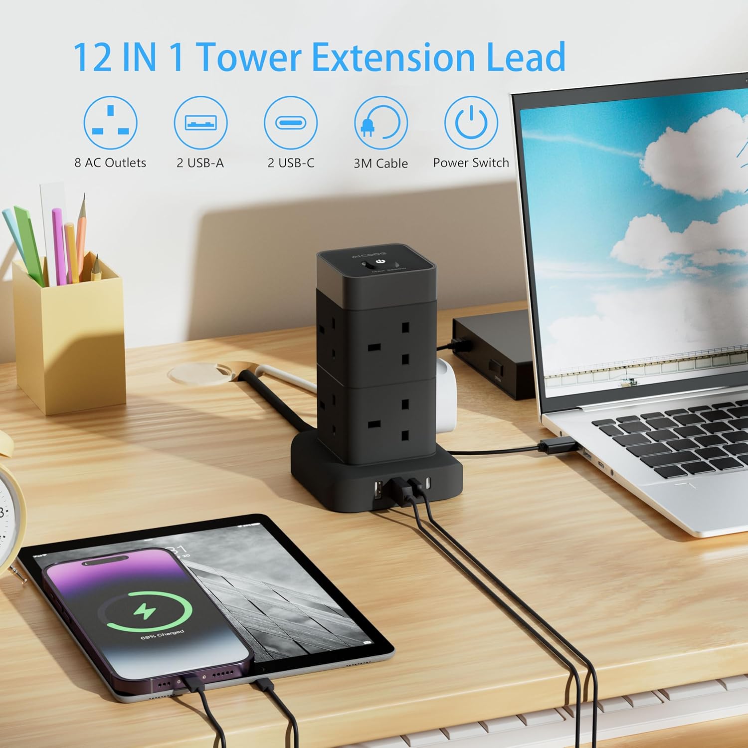 AICODE Tower Extension Lead 3M with 4 USB Slots,8 Way Plug Extension Socket Tower with 2 USB C and 2 USB A Ports,Overload Protected,3M Extension Cable,Power Strip with Switch for Home Office 3250W