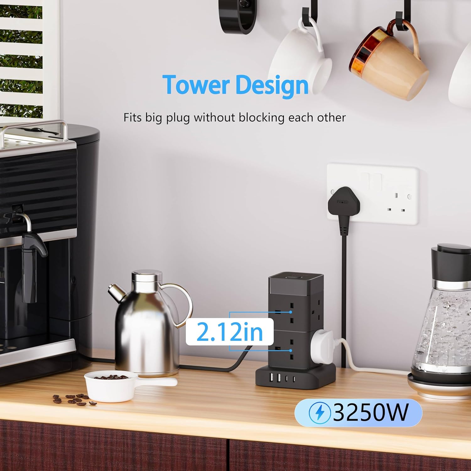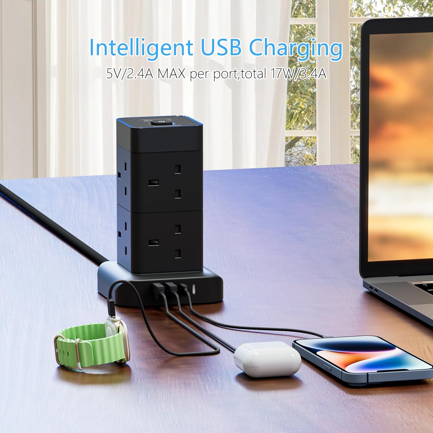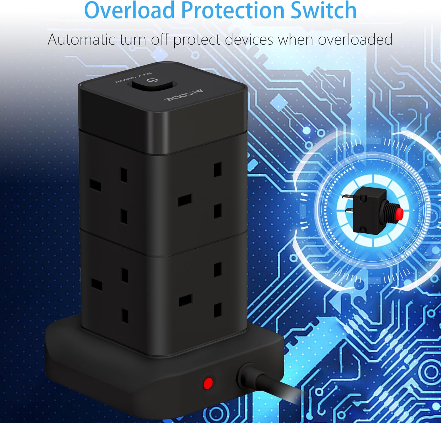 AICODE Tower Extension Lead 3M with 4 USB Slots,8 Way Plug Extension Socket Tower with 2 USB C and 2 USB A Ports,Overload Protected,3M Extension Cable,Power Strip with Switch for Home Office 3250W