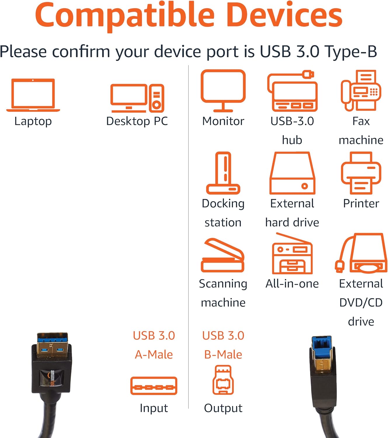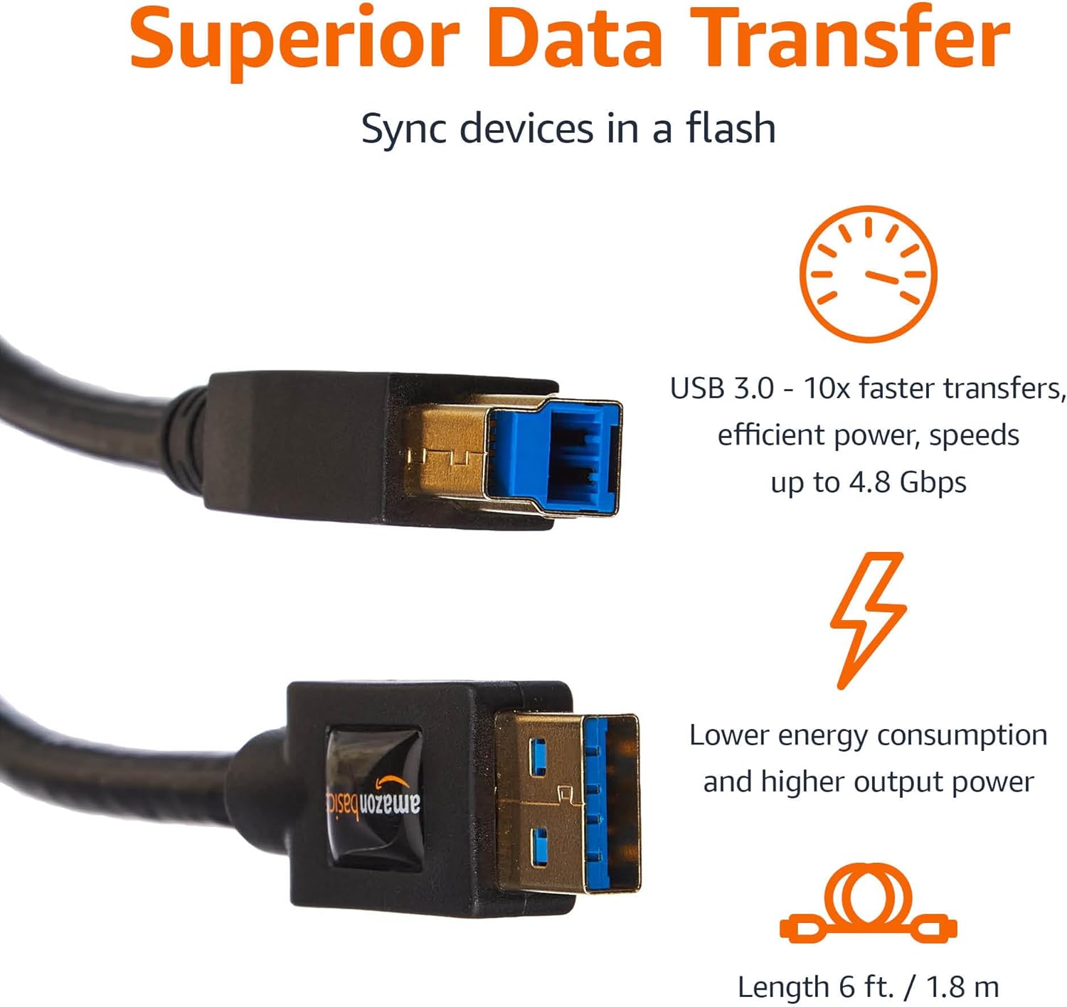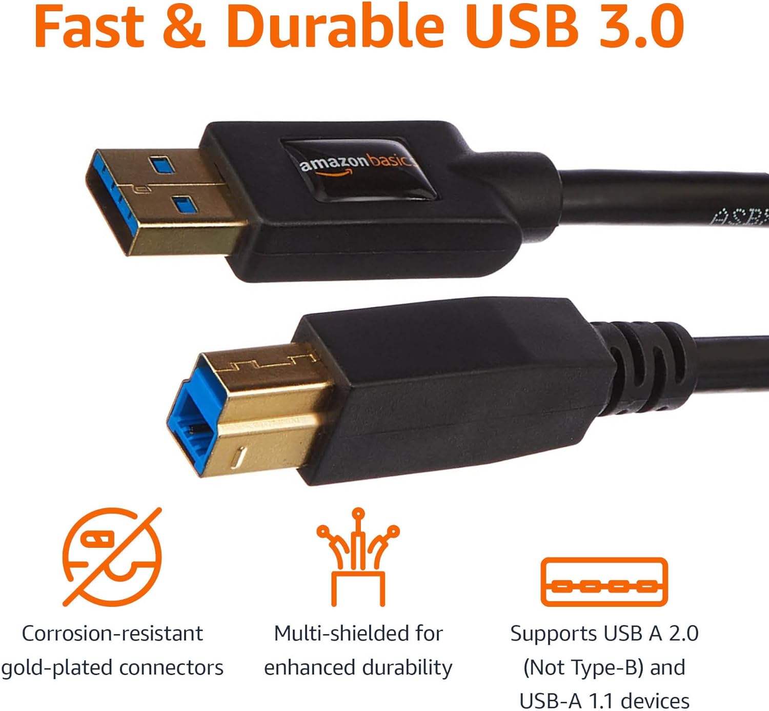 Amazon Basics USB-A to USB-B 3.0 Cable, 4.8Gbps High-Speed with Gold-Plated Plugs, 6 foot, 1.8 m, Black