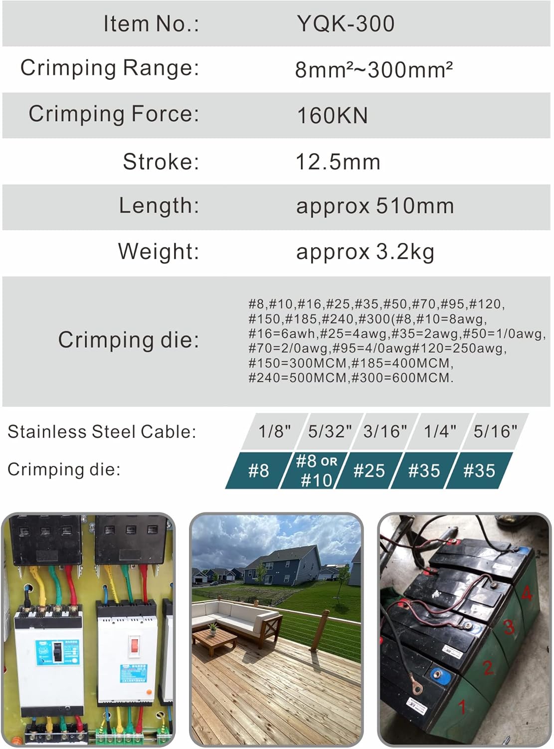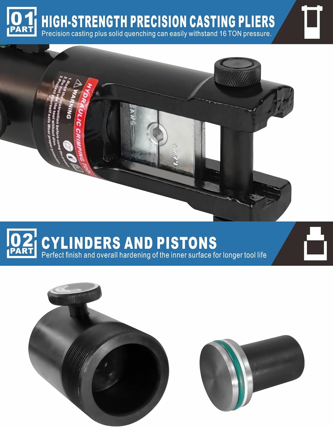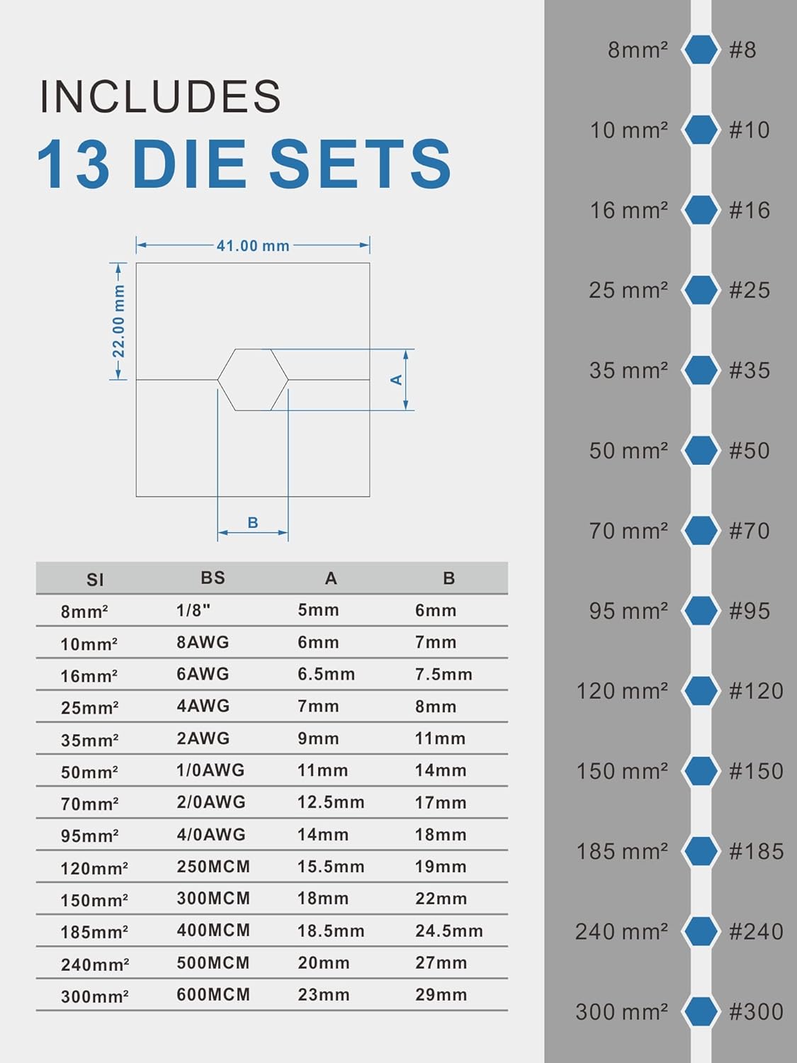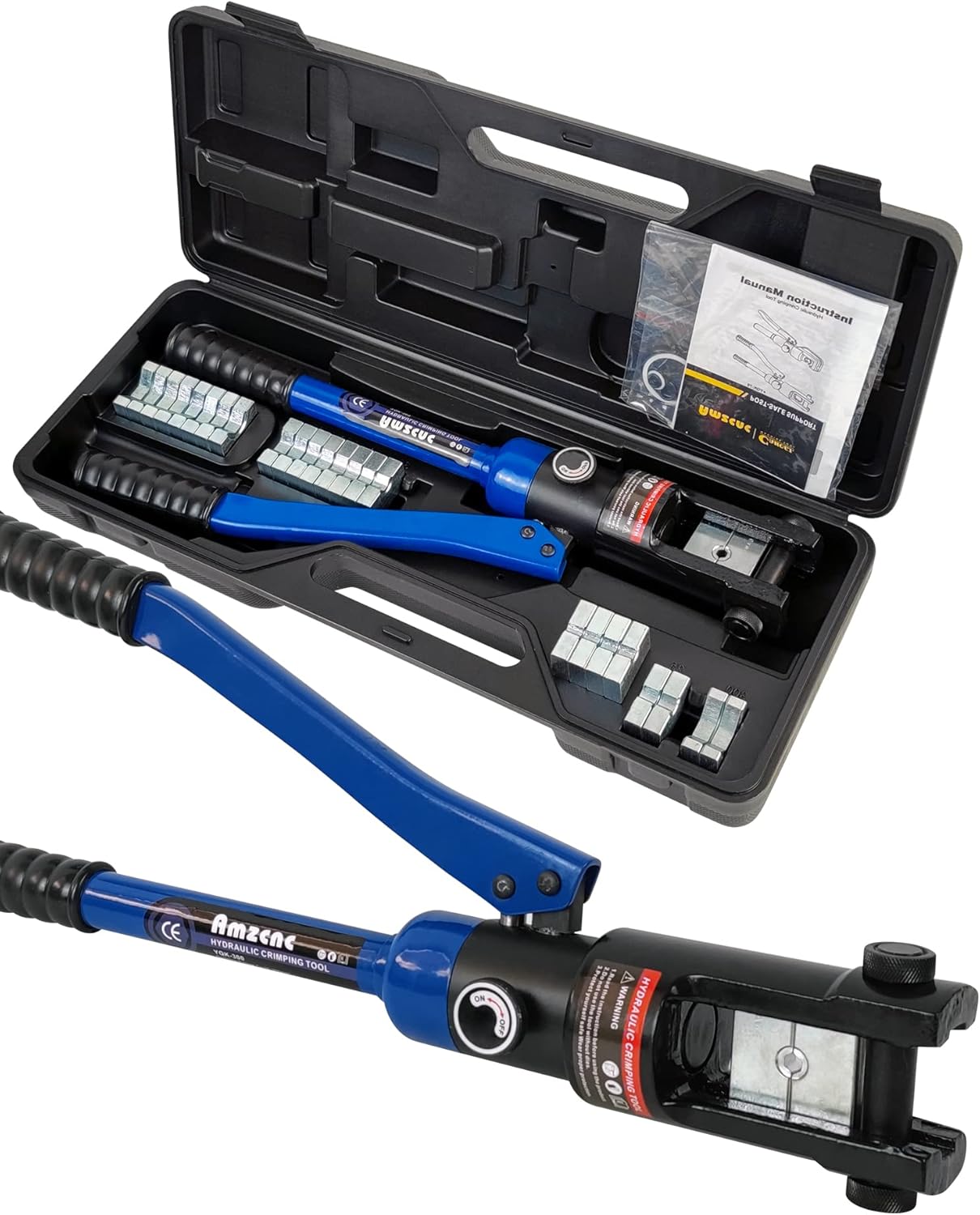 AMZCNC Hydraulic Crimping Tool 16T with 13 Dies of 8-300mm² in Thick Chrome, Insulated Handle, Steel Body, Ideal for Terminating Copper/Aluminum Lugs Terminals