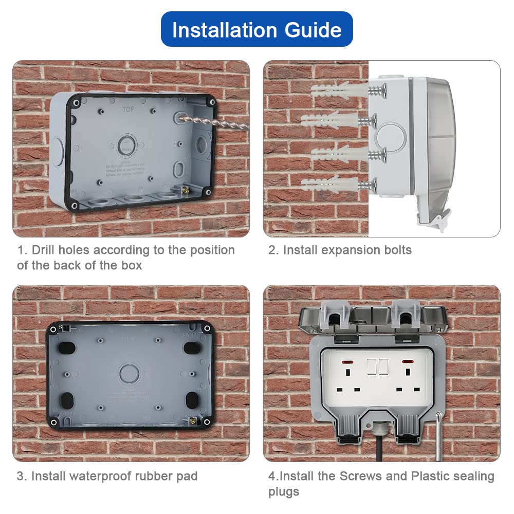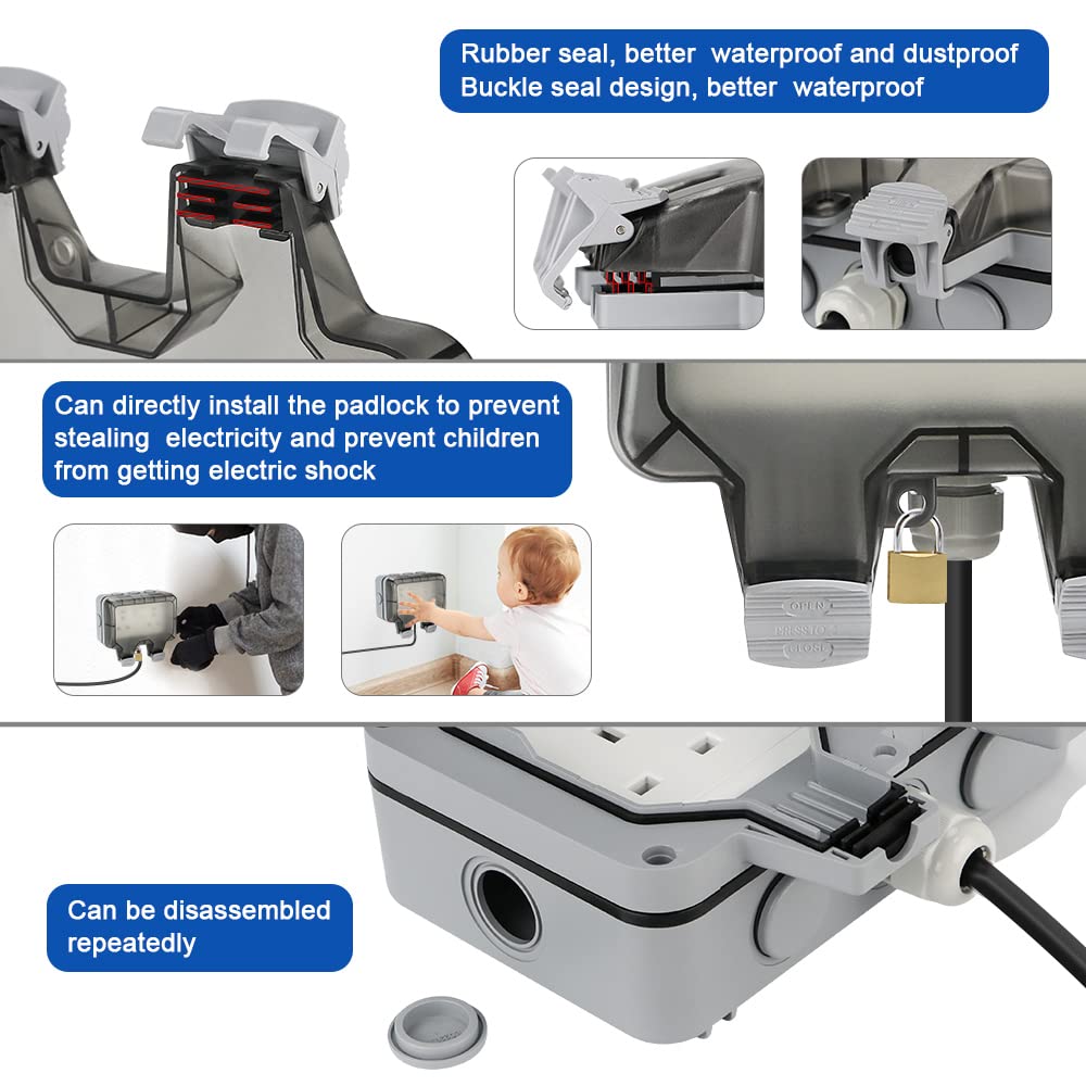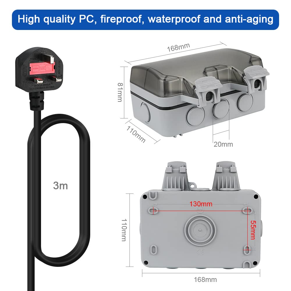 Anesty Outdoor Socket, Outdoor Double Plug Sockets Waterproof IP66 with 3m Extension Lead, Weatherproof Outdoor Plug Sockets, Exterior Wall Garden 2 Gang Storm Switched Socket Outside Power Socket