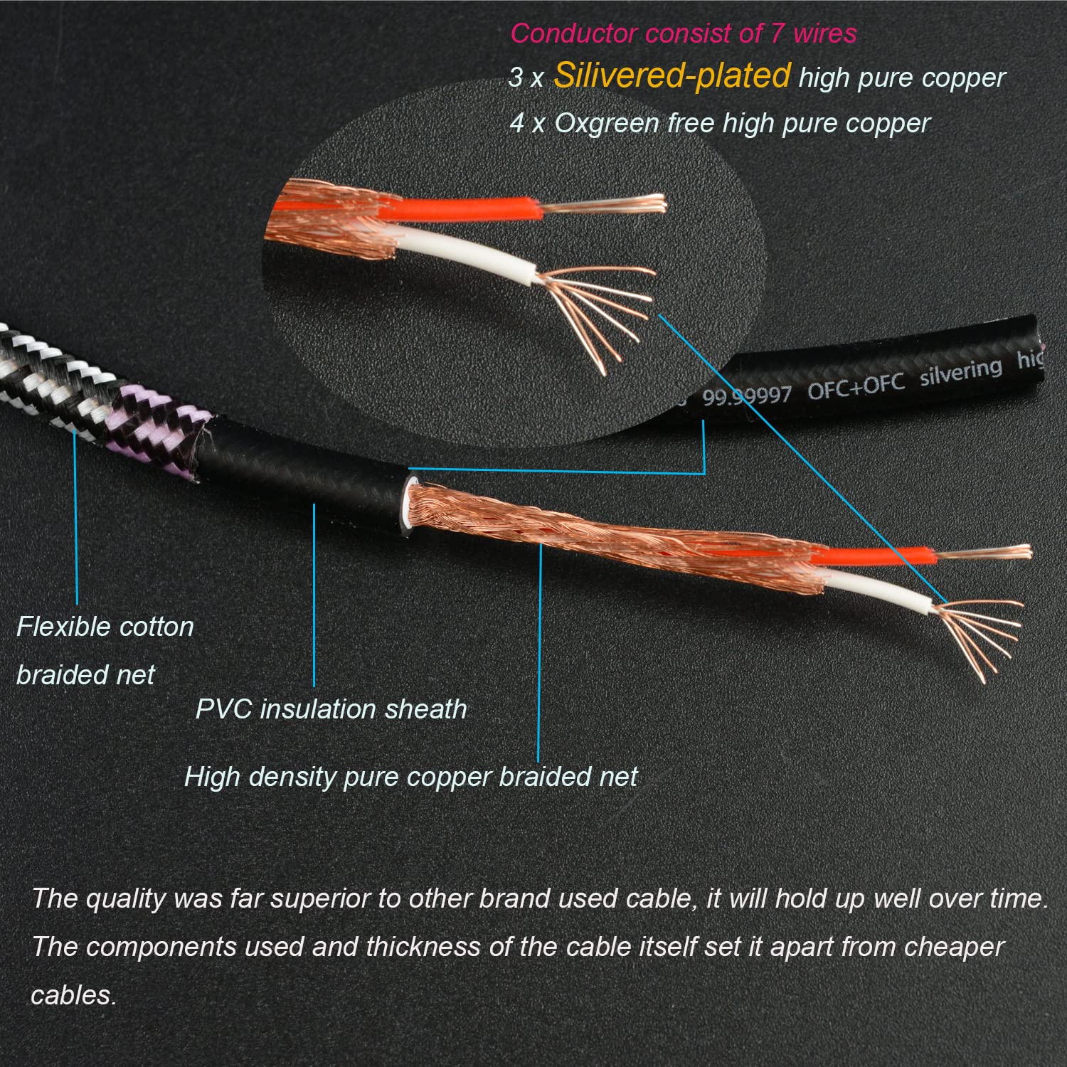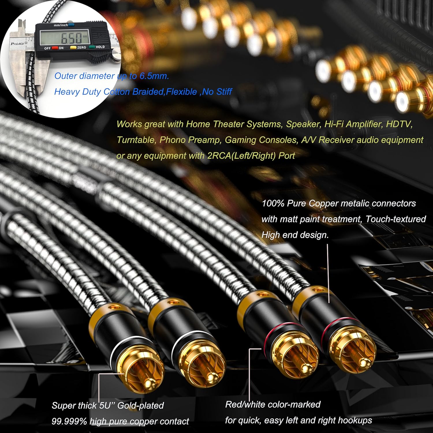 This audiophile RCA cable is designed for high-quality audio transmission, featuring a 1M/3.2FT length and a robust construction. The cable utilizes a 20 AWG wire gauge and a 4N oxygen-free copper core, ensuring minimal signal loss. With a thick outer diameter of 6.2mm, it is built for durability and flexibility. The jacket is made from PVC and high-density polyethylene, while the shielding consists of 95% high-density oxygen-free copper, effectively blocking interference.