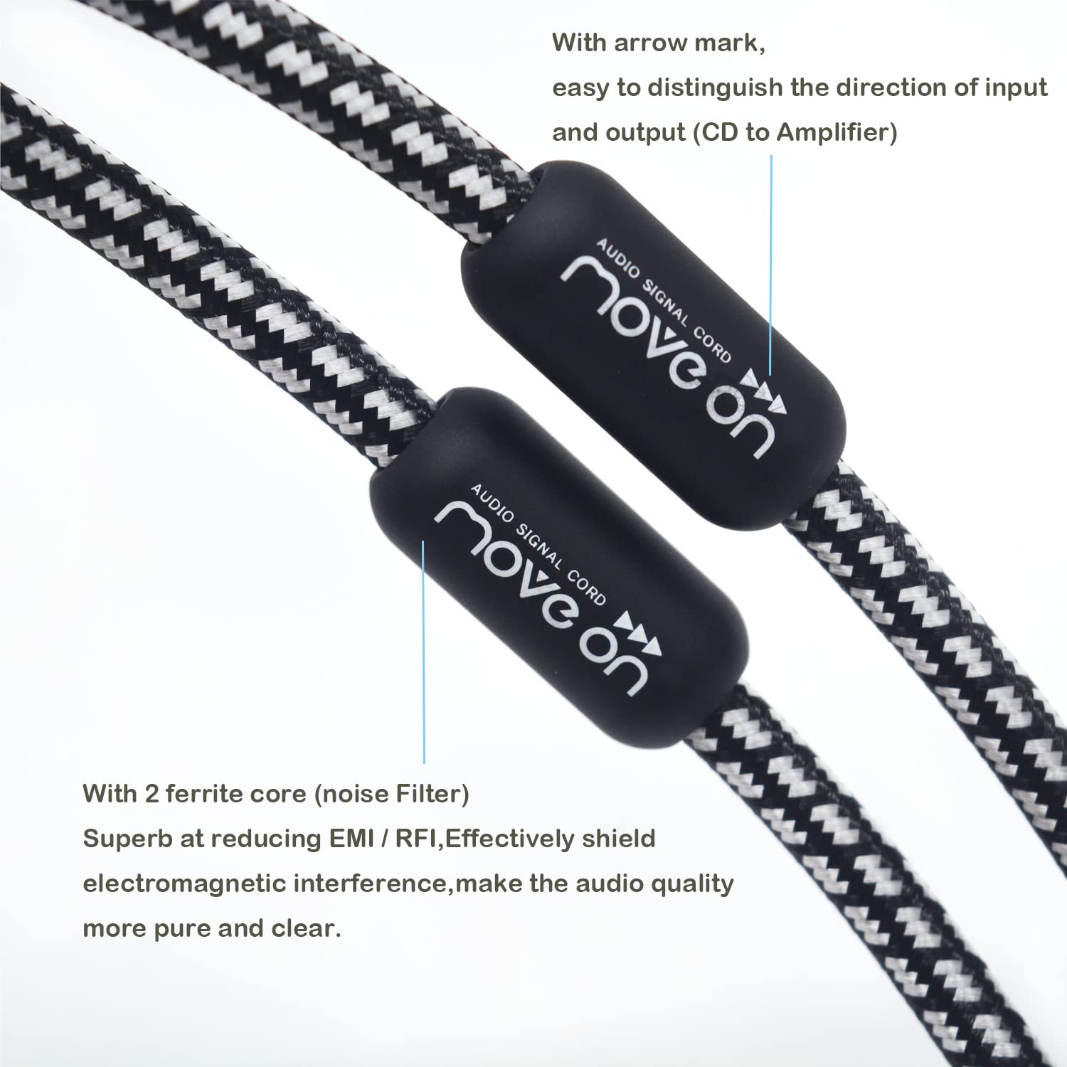 Additionally, the cable includes two ferrite noise filters to reduce electromagnetic interference, enhancing audio quality. It is compatible with various audio systems, including home theaters and high-fidelity amplifiers.