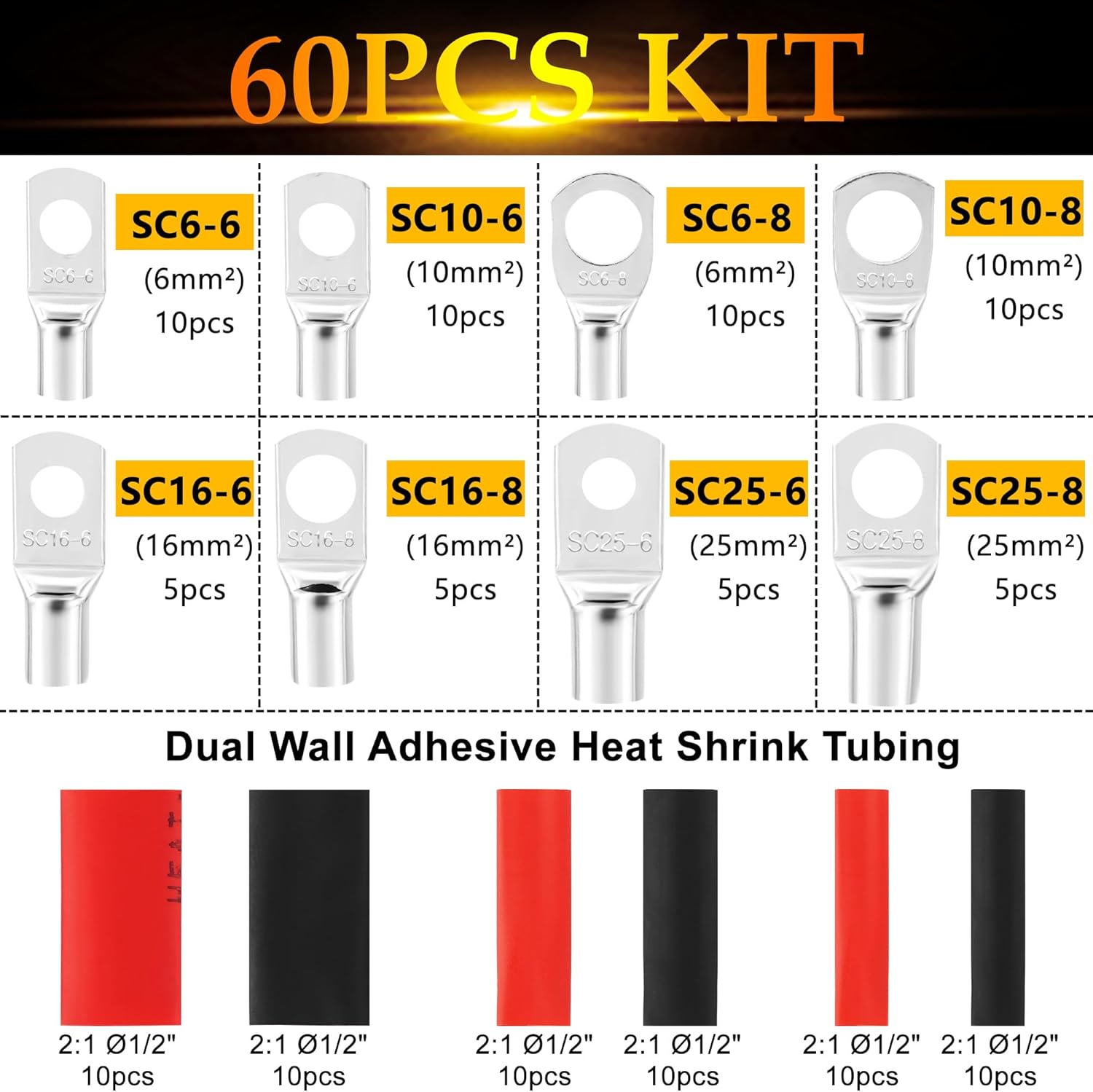 Battery Cable Lug Crimping Tool with 60Pcs Copper Ring Terminals 8 Sizes Cable Lugs and 60pcs Heat Shrink Tubing Set, Heavy Duty Wire Crimper for Battery Wire Terminal (HX50B Crimper+60PCS Terminals)