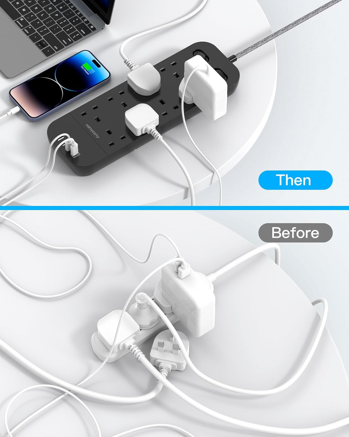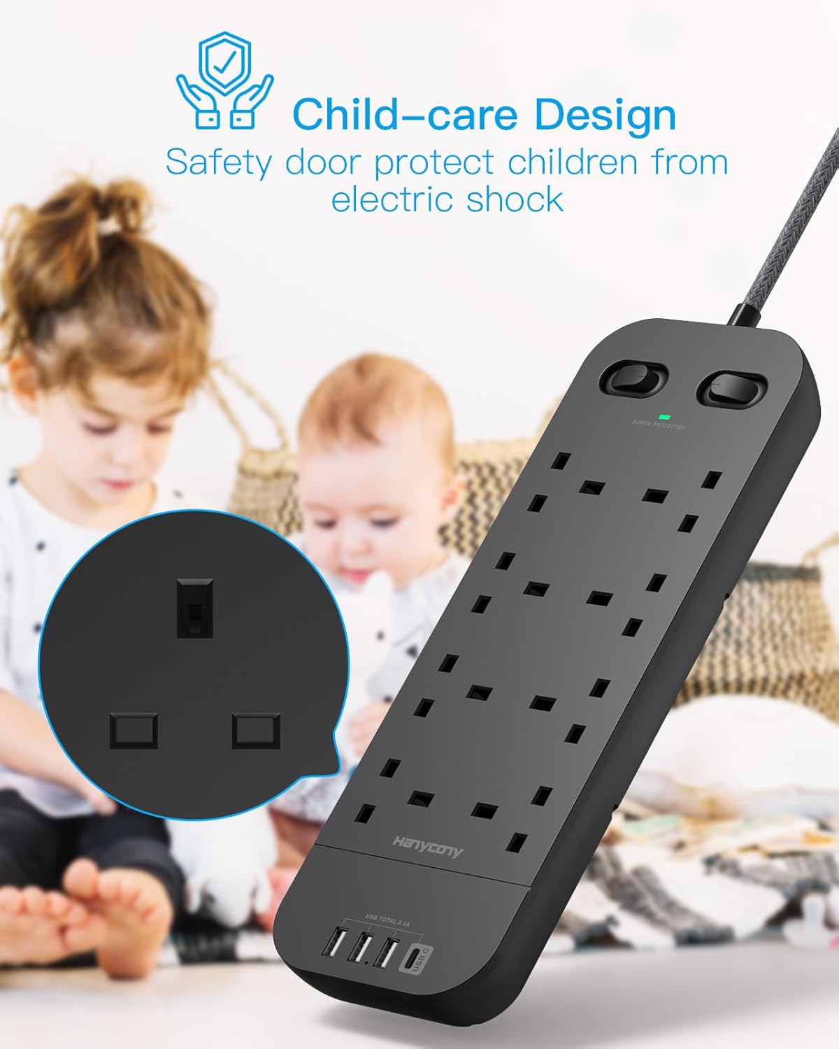Black Extension Lead, 8 Way Outlets Power Strip with 4 USB Ports, 1800J Surge Protection Double Switch Plug Extension with 1.8M Braided Extension Cord for Home, Office