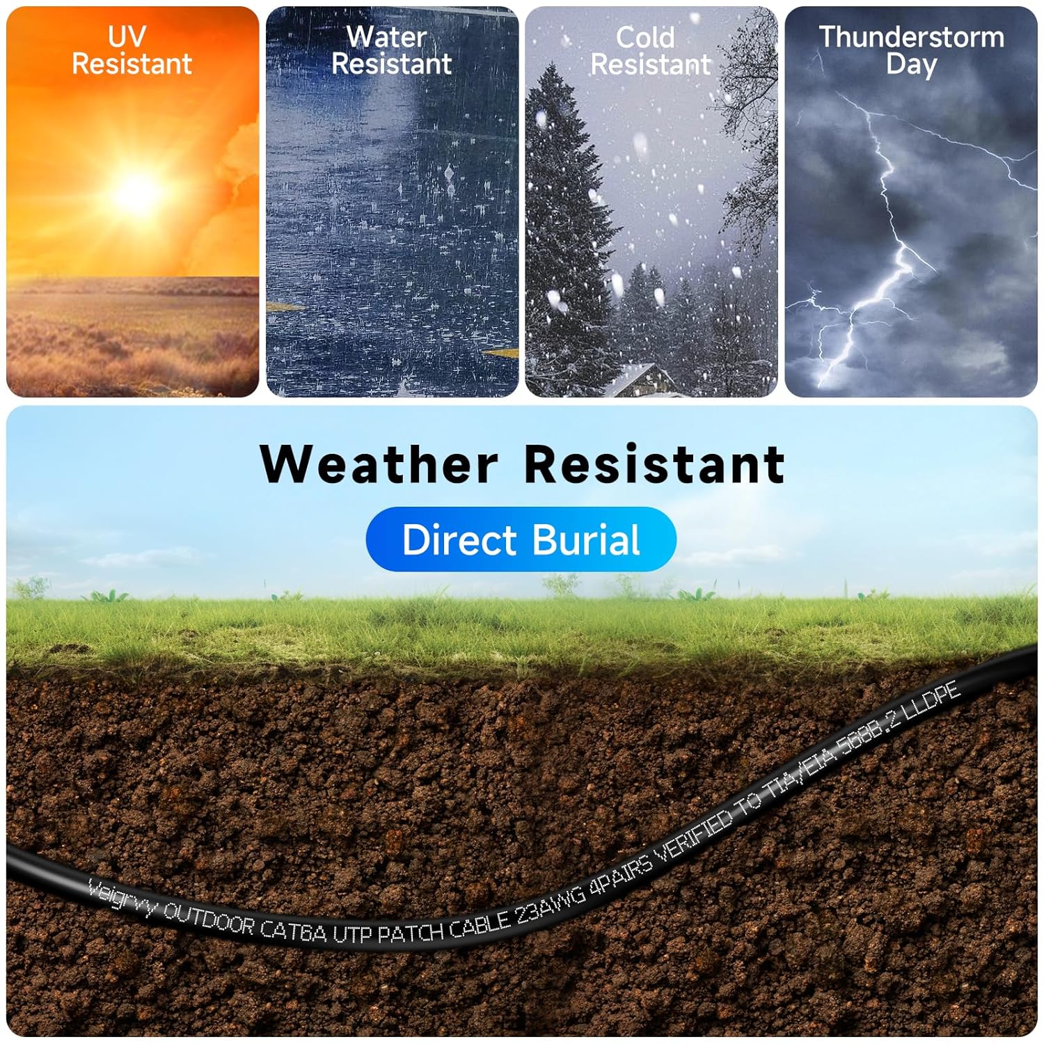 The Veigrvy Cat 6A Outdoor Ethernet Cable is designed for high-speed internet connectivity in outdoor environments. With a direct burial capability, this cable can be installed underground without compromising connection quality. Key features include: