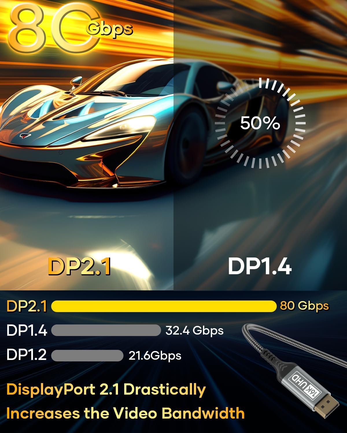 DisplayPort Cable 2.1 3M-DP Cable Supports 16K@60Hz, 10K@60Hz, 8K@120Hz, 4K@240Hz/165Hz/144Hz, 2K@360Hz/240Hz, 80Gbps, HDR, DSC1.2a, FreeSync, G-Sync for Gaming Monitor, Graphics Card, PC