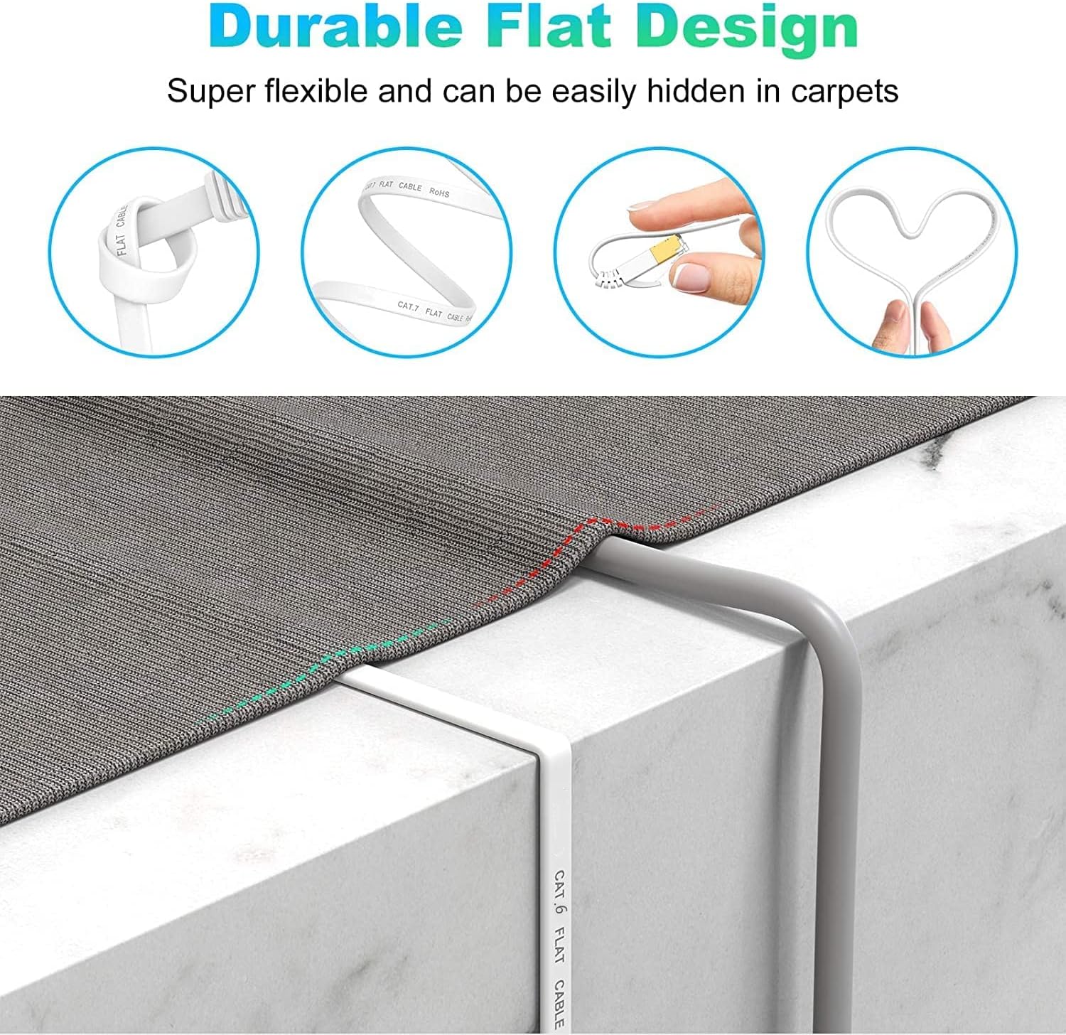 Ethernet Cable 2 m, Cat 6 high speed Lan Cable Flat Patch Network Cord faster than Cat5e/Cat5, Internet cable with RJ45 Connector, Compatible with Router, Modenm, Laptop ,Smart TV, ideal for Gaming