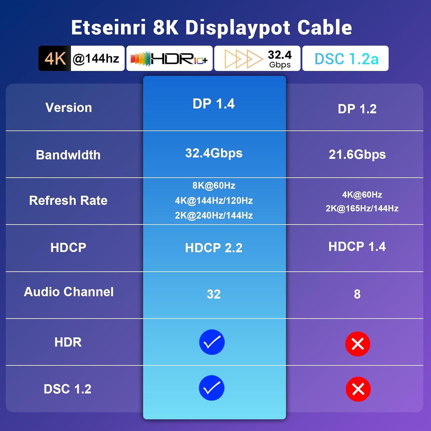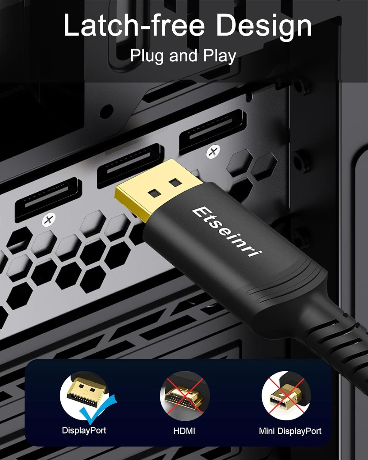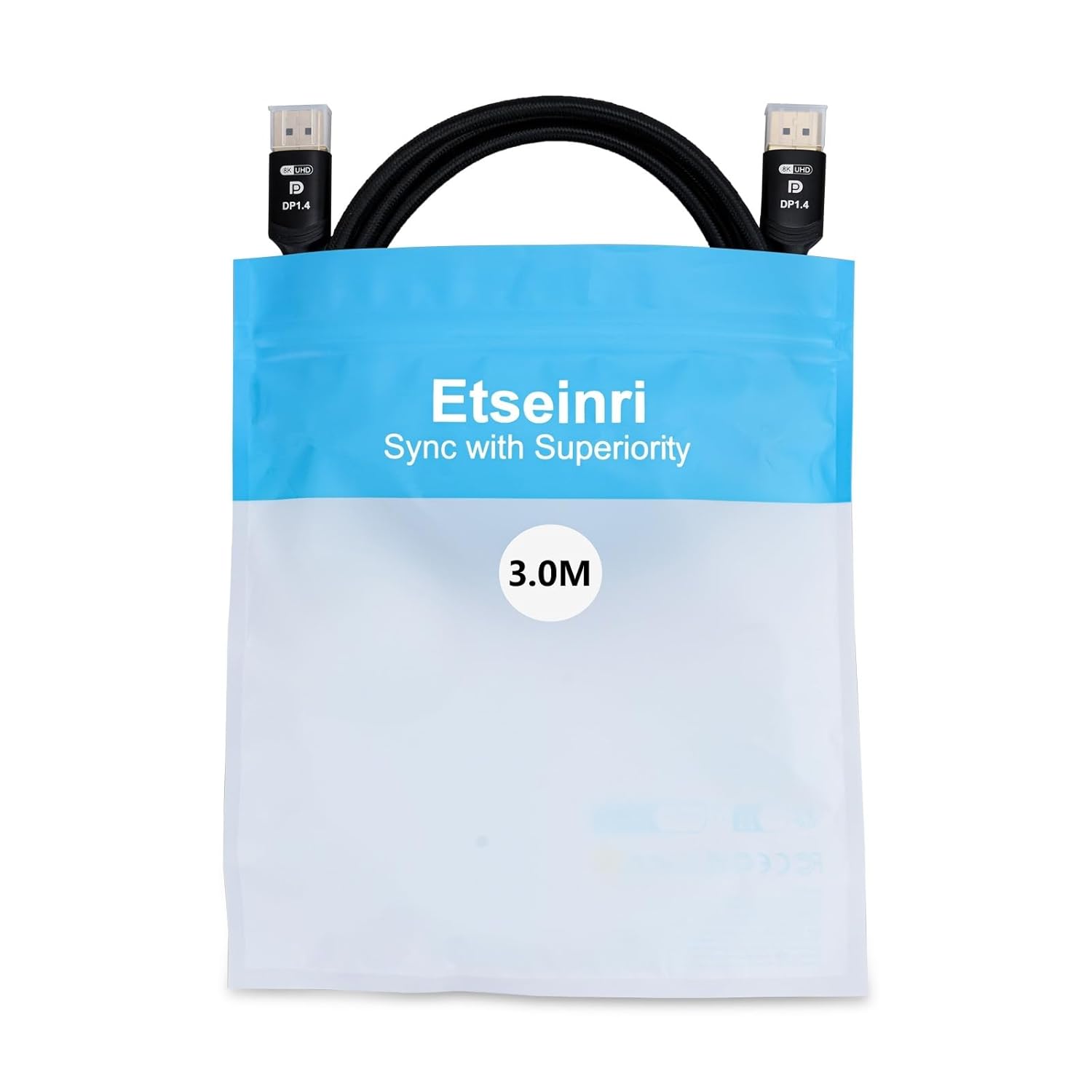 Etseinri DisplayPort Cable 3M, Certified Display Port Cable HDCP DSC1.2 8K 60Hz 4K 165Hz 144Hz 2K 240Hz, HDR10, G-Sync & FreeSync DP to DP Cable for Gaming Monitor PC Projector