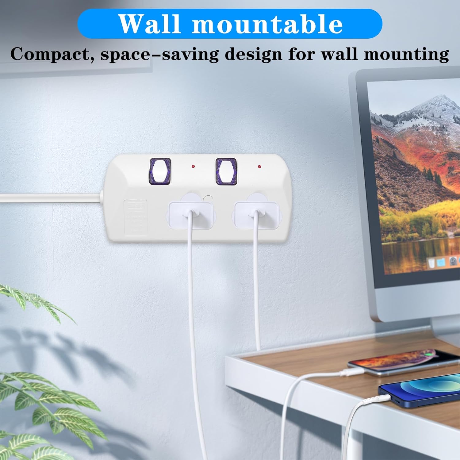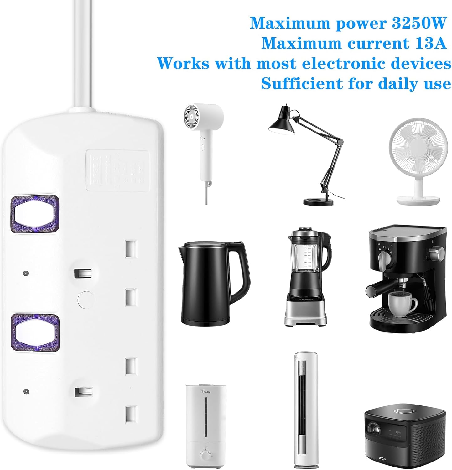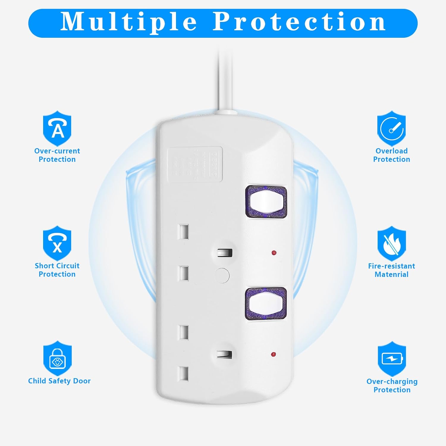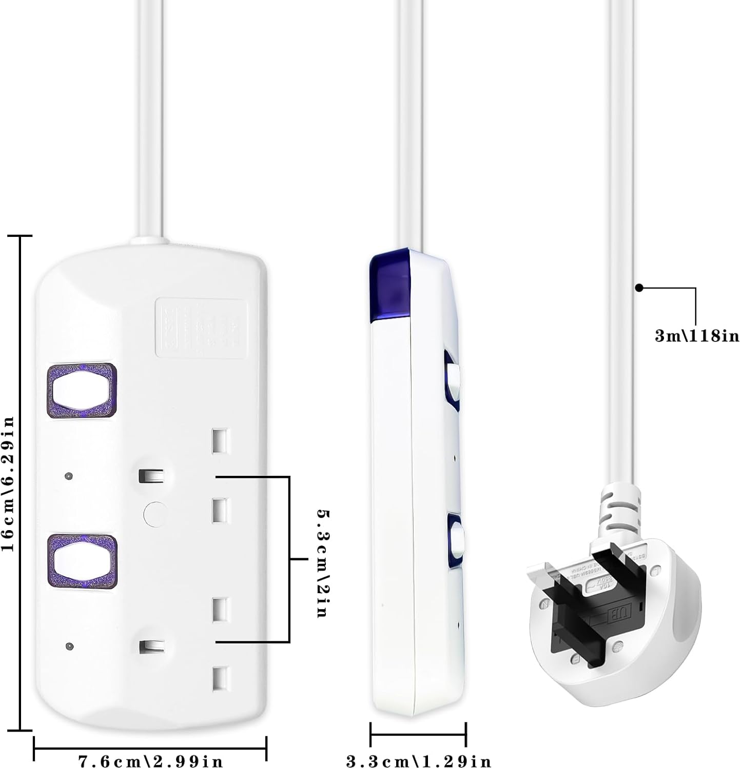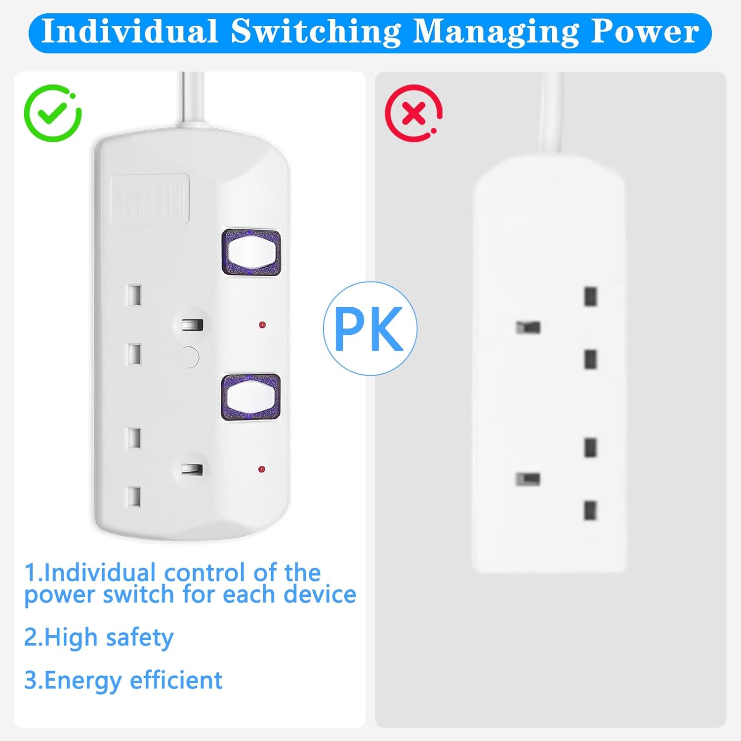 Extension Lead with Individual Switches 3 Metre Heavy Duty Extension Cord, 13A Fused UK Plug, Wall Mountable Power Stripp, 2 Way Plug Sockets