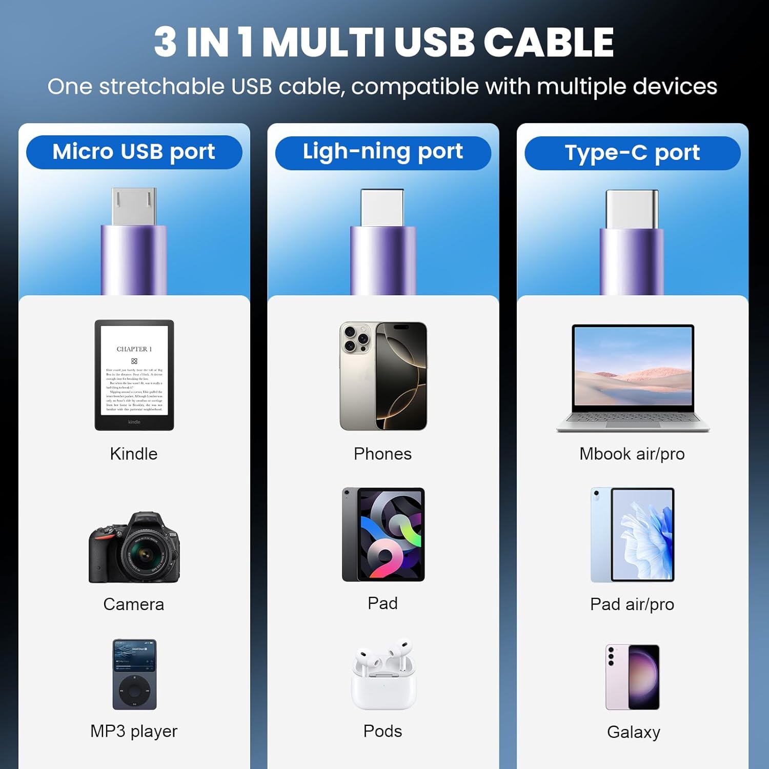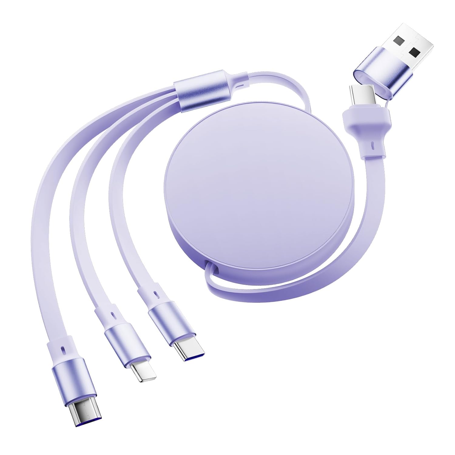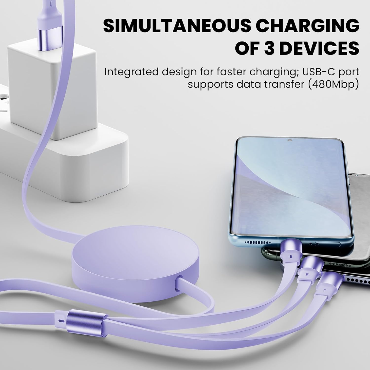 Fast USB Multi Charger Cable, 120W 3 in 1 Multi Charging Cable with USB A/C, Charging Cable for Multiple Devices, Retractable Charger Cable Compatible for Phone, Pad, Laptop, Galaxy (Purple)