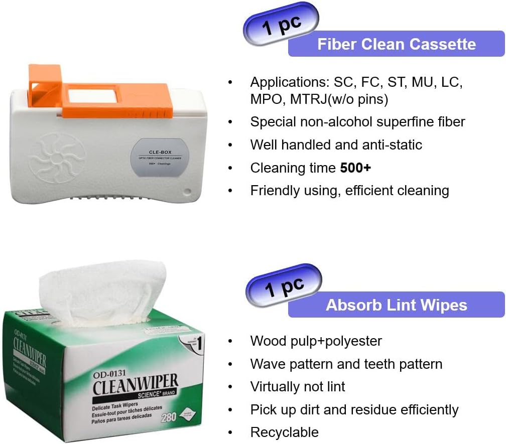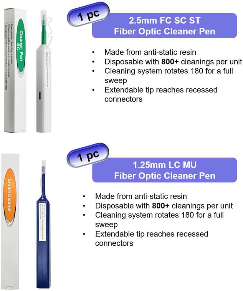 Fiber Optic Cleaning Kit FTTH Fiber Cleaner Tools Set with 1.25mm / 2.5mm Fiber Optic Cleaner Pens and Cleaning Sticks Wipes for Cleaning FC SC ST LC MU Connectors