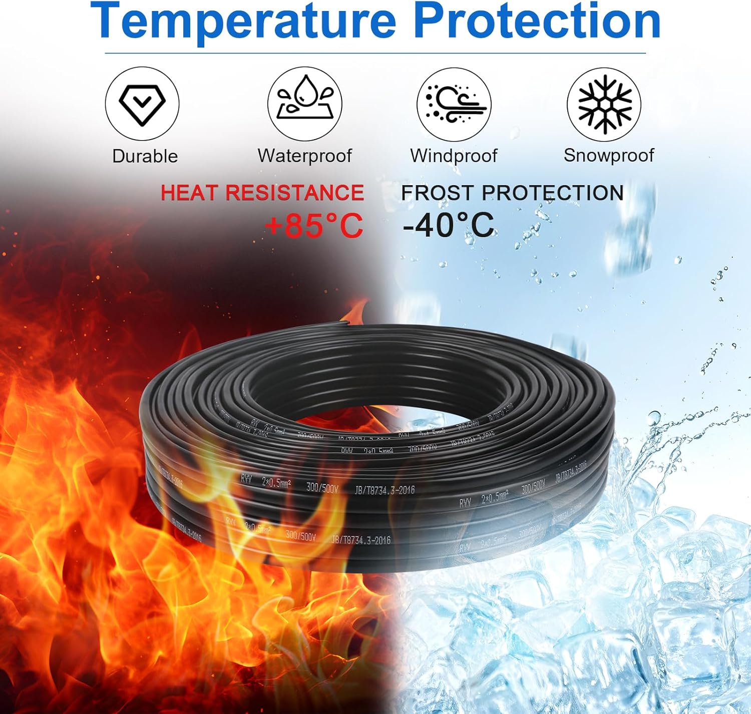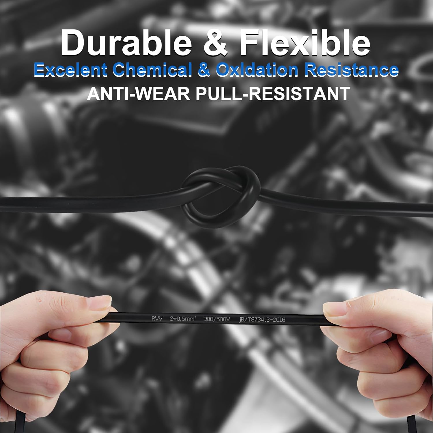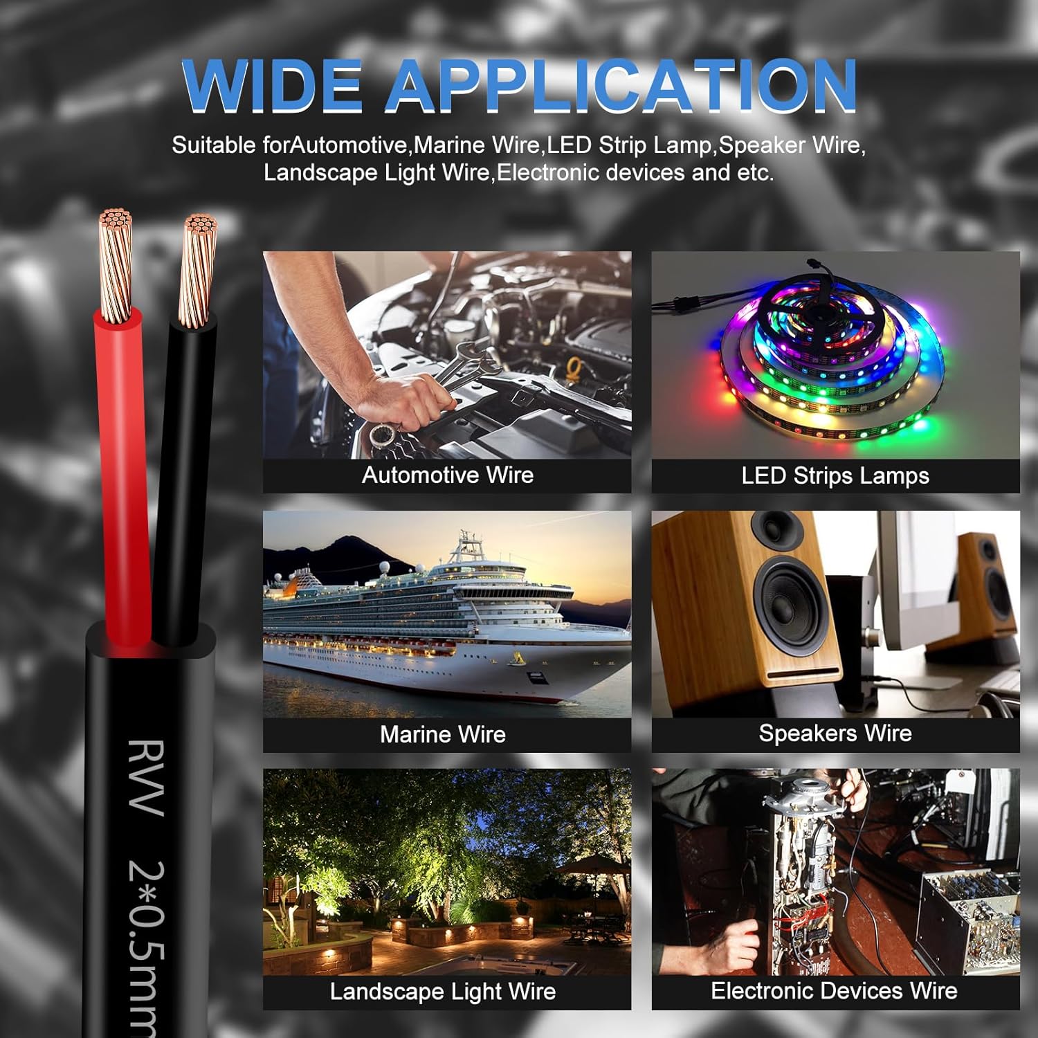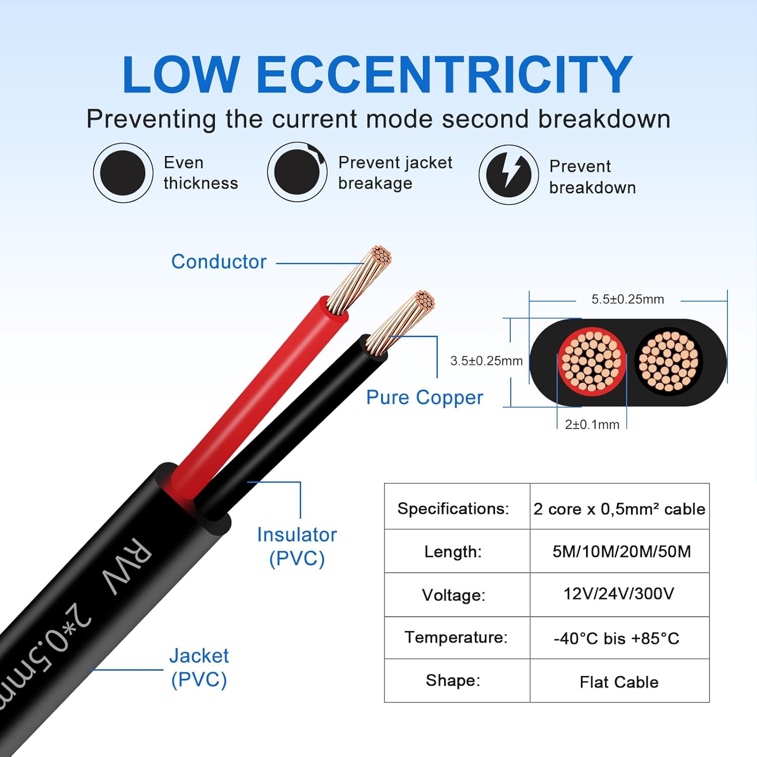 Flat 2 Core Cable Twin Red/Black Copper Trailer Caravan Auto Boat Cable Wire 12V/24V,Suitable for LED Light Wiring Connections(2 Core 0.5mm²,20M)