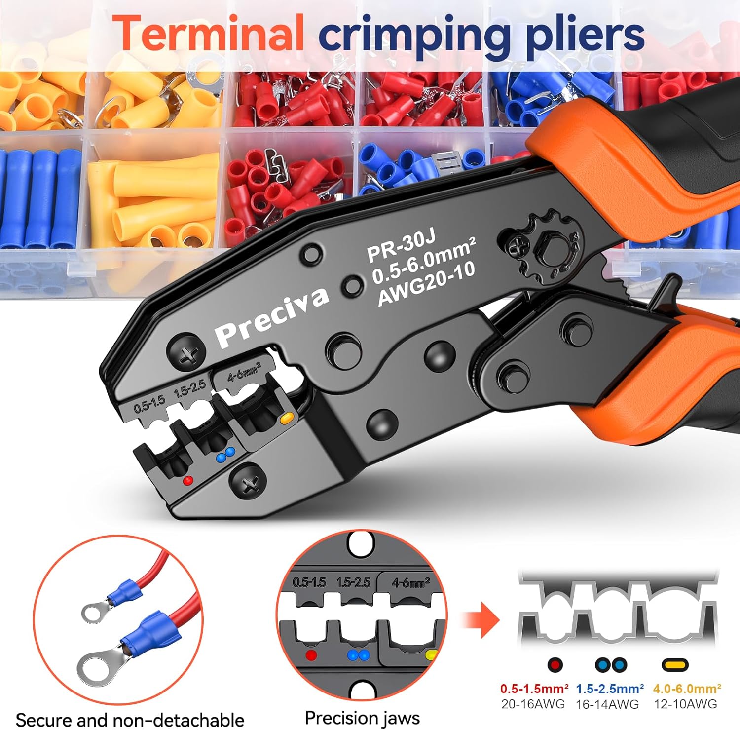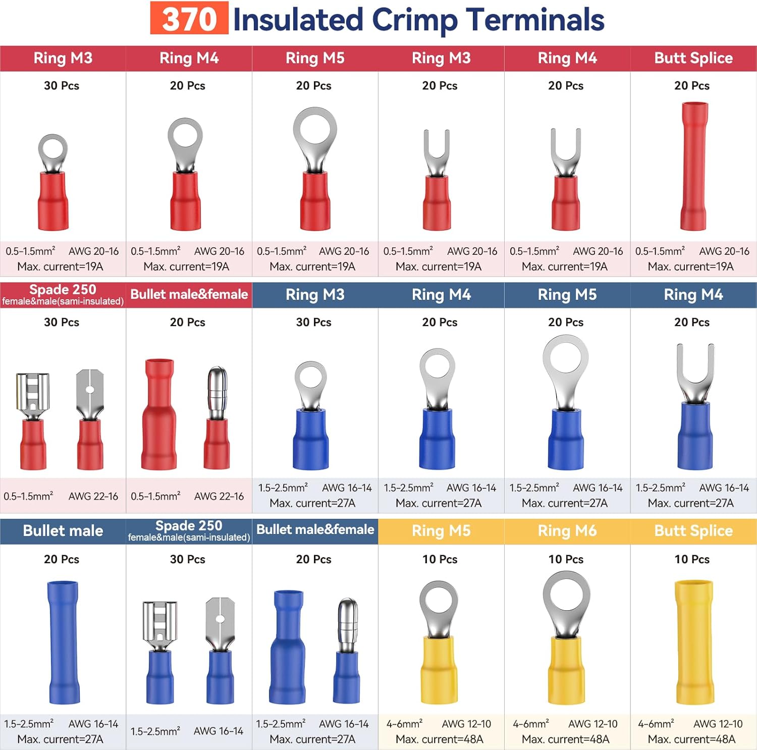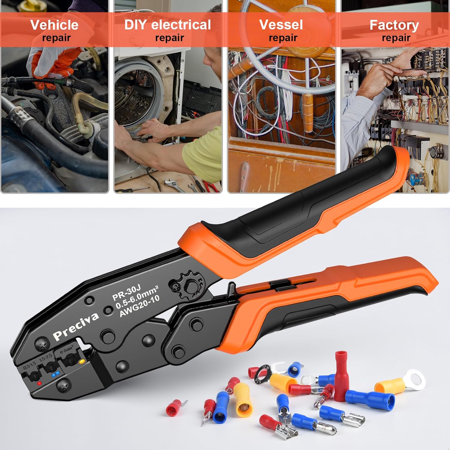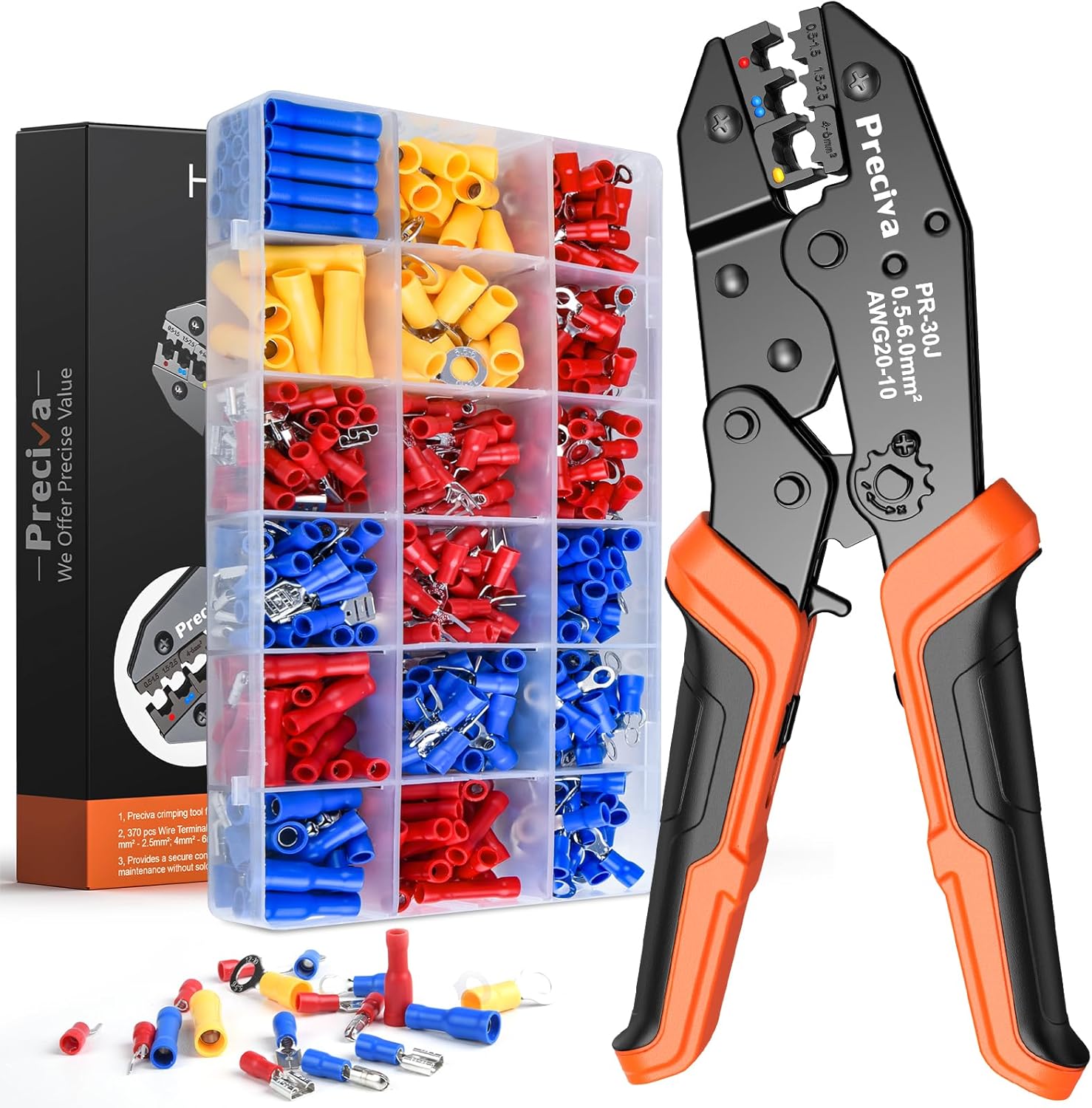 Insulated Crimping Tools, Preciva 0.5-1.5/1.5-2.5/4-6mm²(A.W.G. 20-10) Crimping Tool, with 370pcs terminals. Suits Electrical Wiring Repair, Car, Van, Motorbike etc