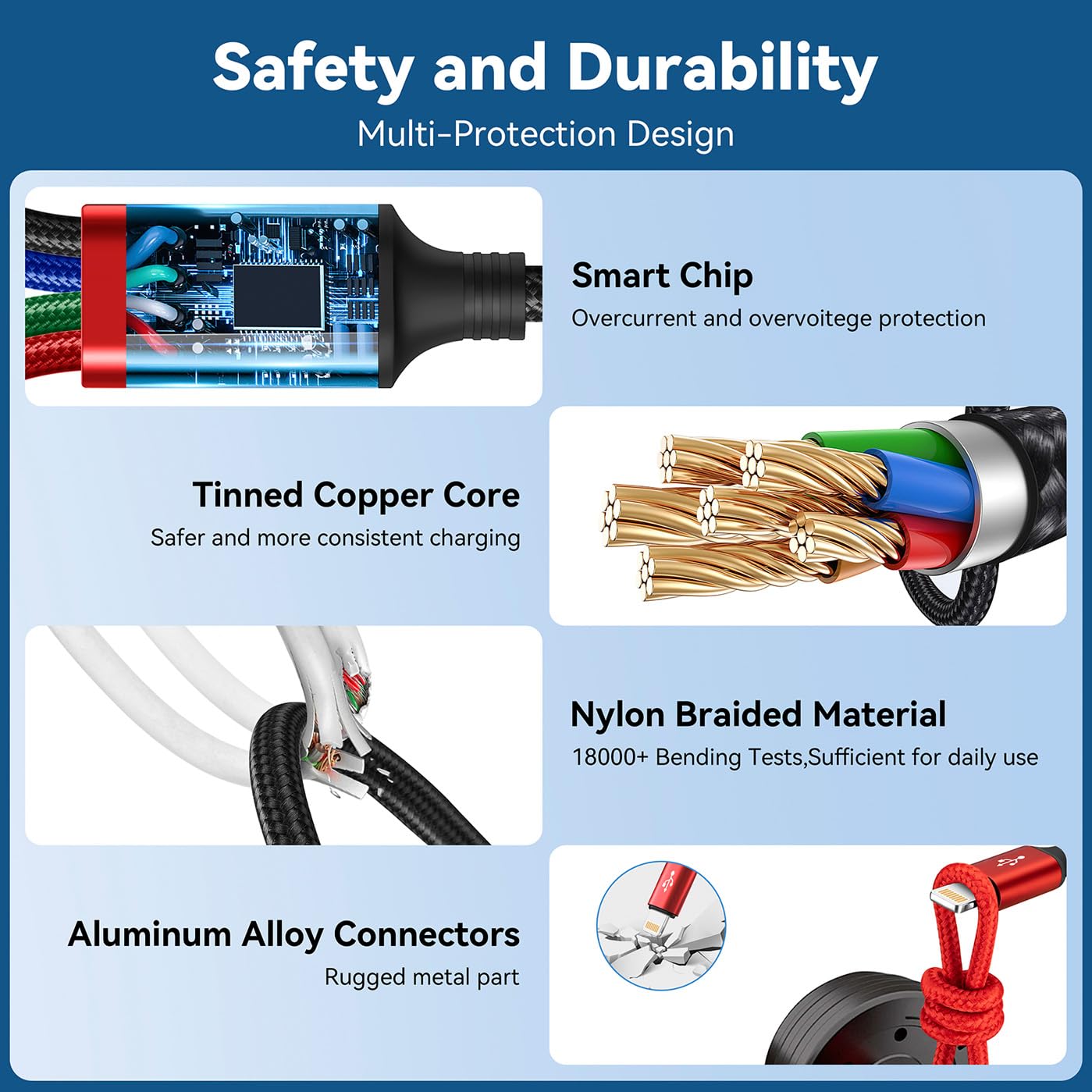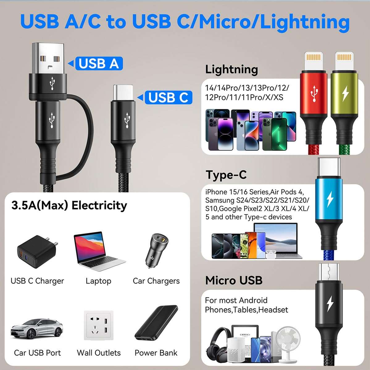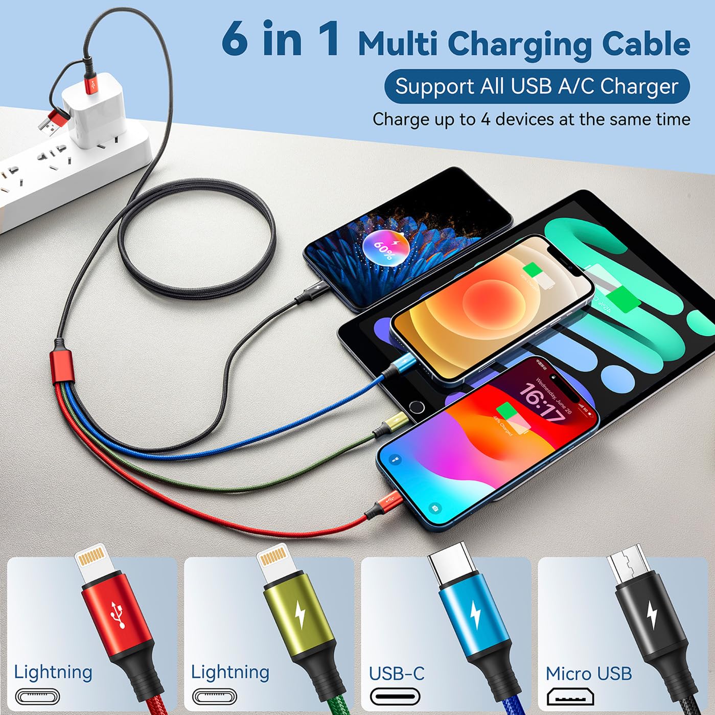 Minlu 4 in 2 Multi Charging Cable, USB Multi Charger Cable with Data Transfer[3.5A 1.2M] Nylon Braided Phone Charger Cables, USB A/C to Lightning/Type C/Micro for iPhone/Galaxy/Android/Tablet