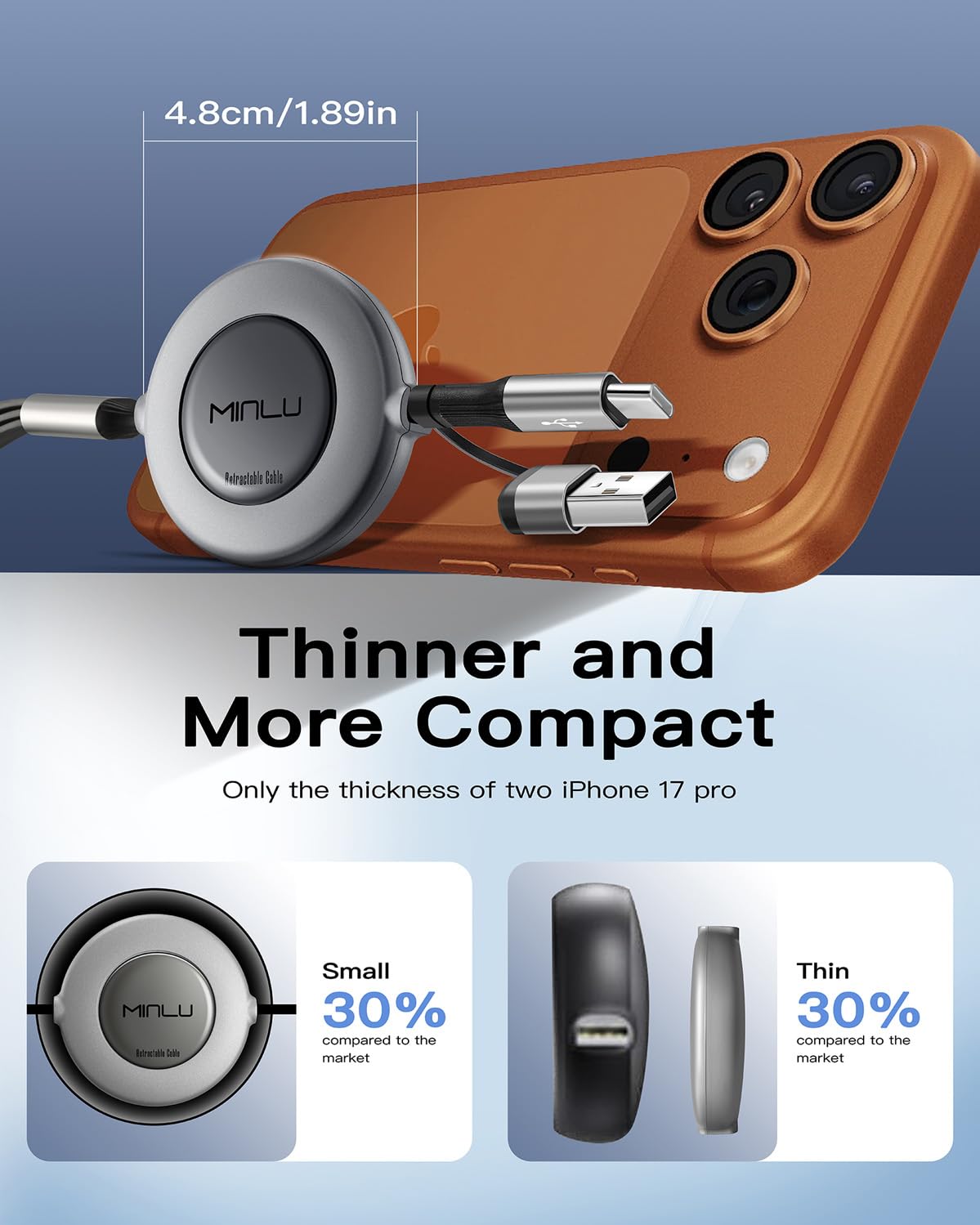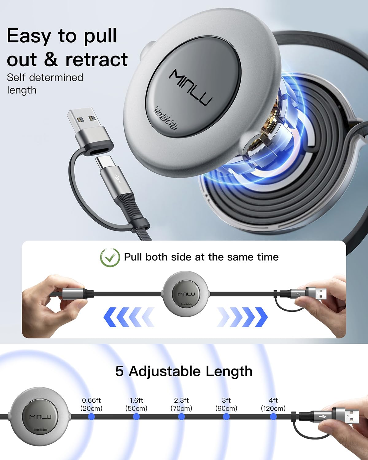 Minlu Multi Charger Cable, 5 in 1 Retractable Charging Cable with Data Transfer, 2Pack Retractable USB C Cable, USB Charging Cable for iPhone 17 16 15 14 13 12 11/Samsung Series/Huawei/Tablet/Android