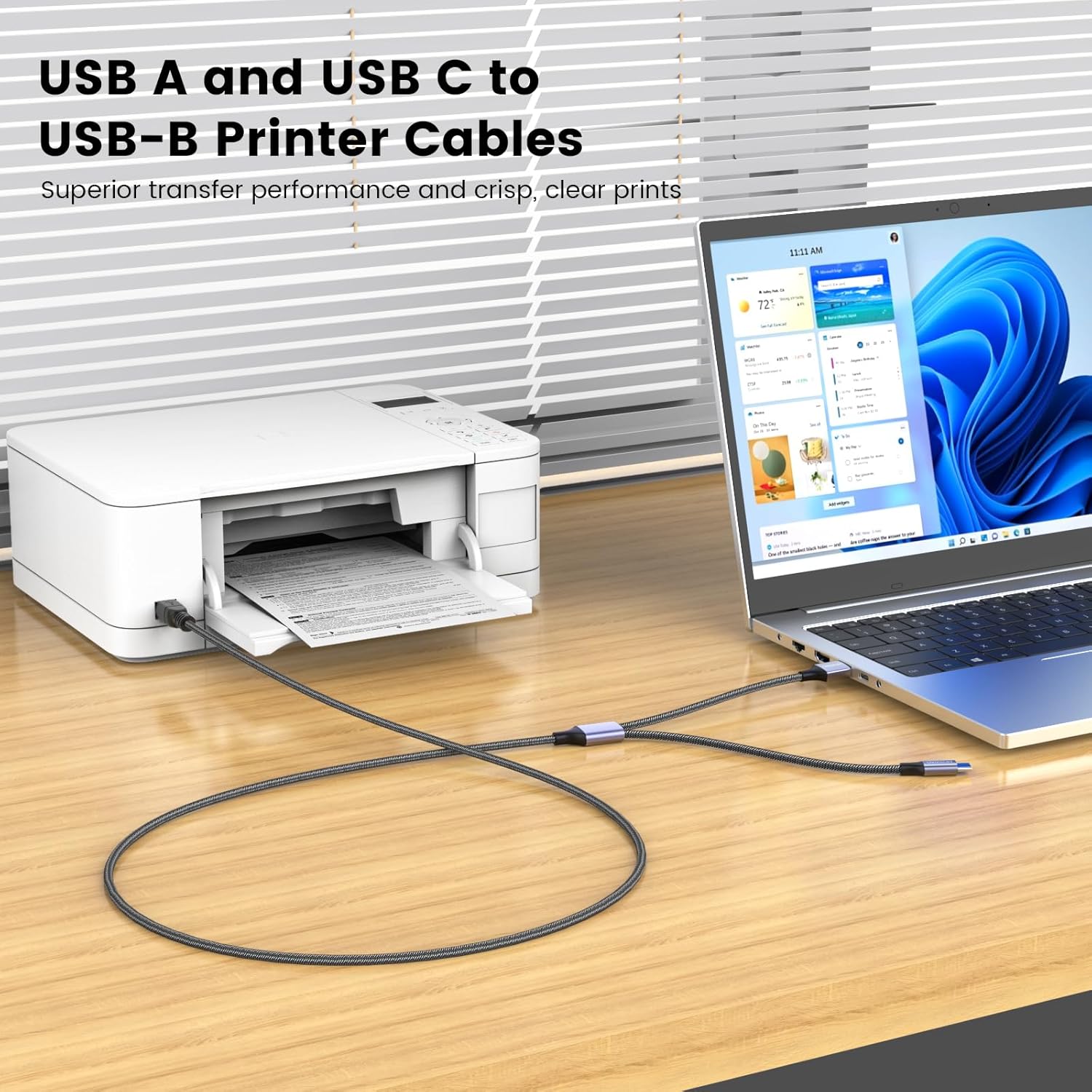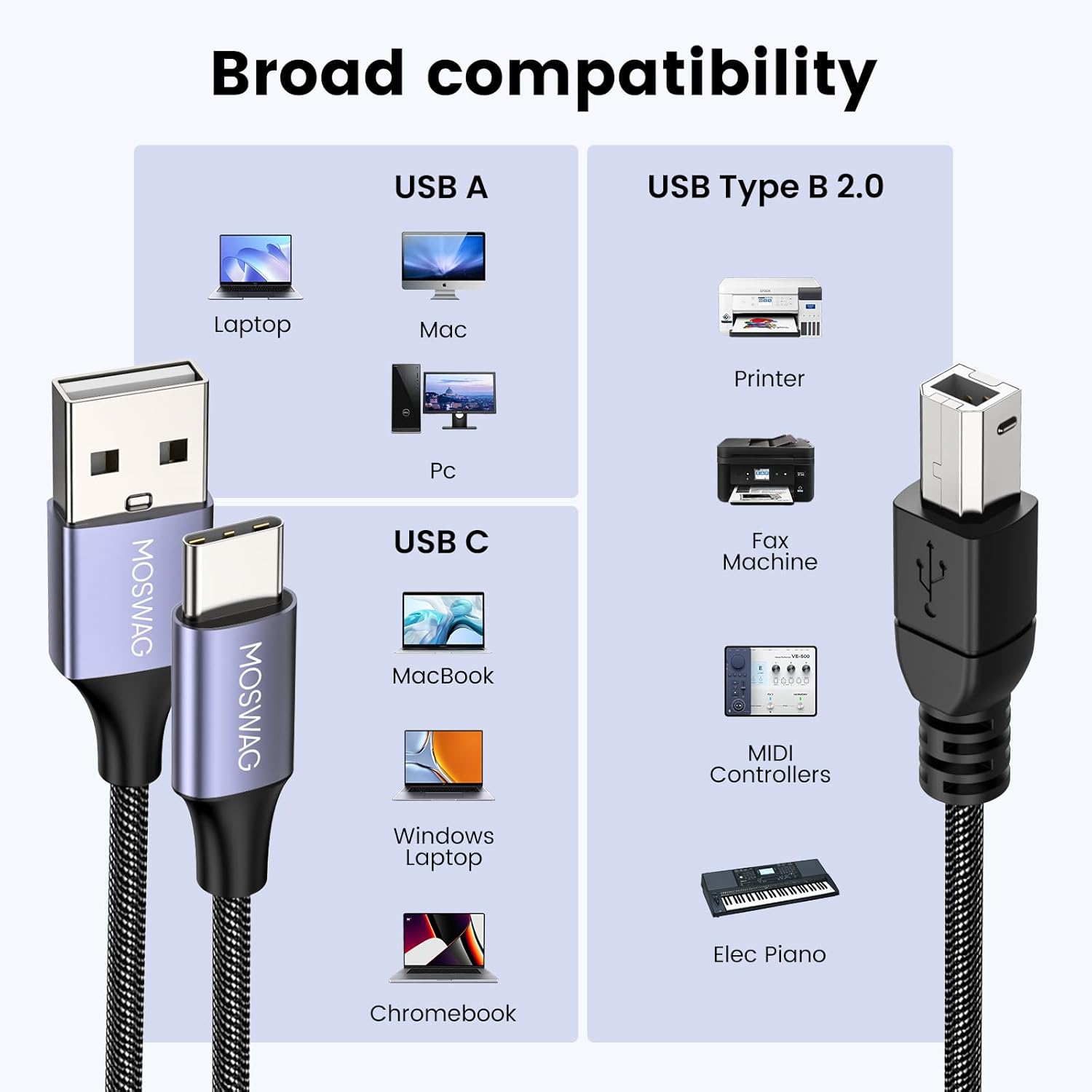 The MOSWAG 2-in-1 USB-C to USB-B Printer Cable is designed for versatile connectivity. It is compatible with a range of devices including MacBook Pro, HP, Canon, Brother, and Samsung printers. This 5Feet/1.5M cable allows for easy data transfer between your USB B devices and computers or laptops.
