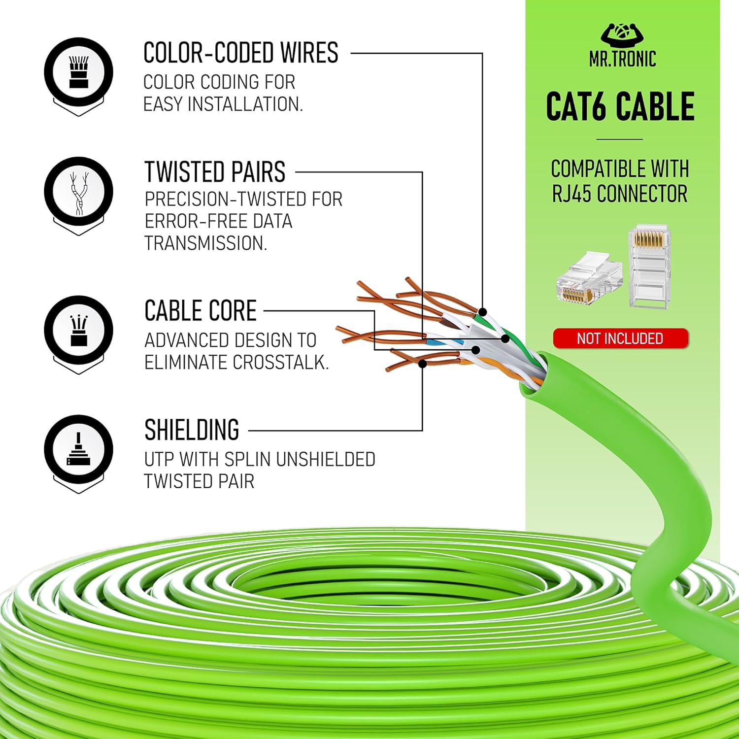 Mr. Tronic Bulk Cat 6 Ethernet Cable 50m, High Speed LAN Ethernet Network Cable, 50m Bulk Cat6 Internet 1 Gbps, 250 MHz, ADSL AWG24, UTP CCA (50 Meters, Green)