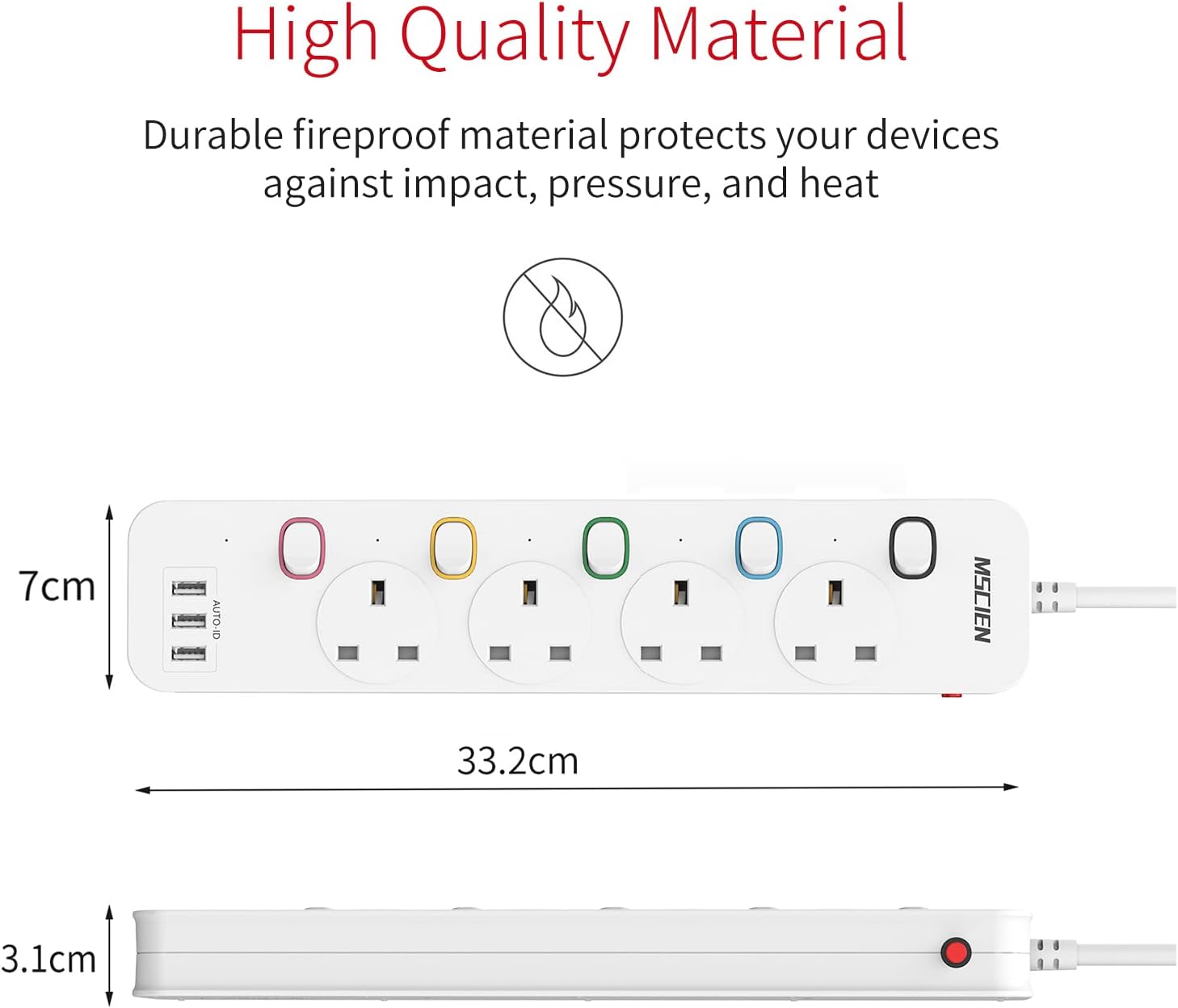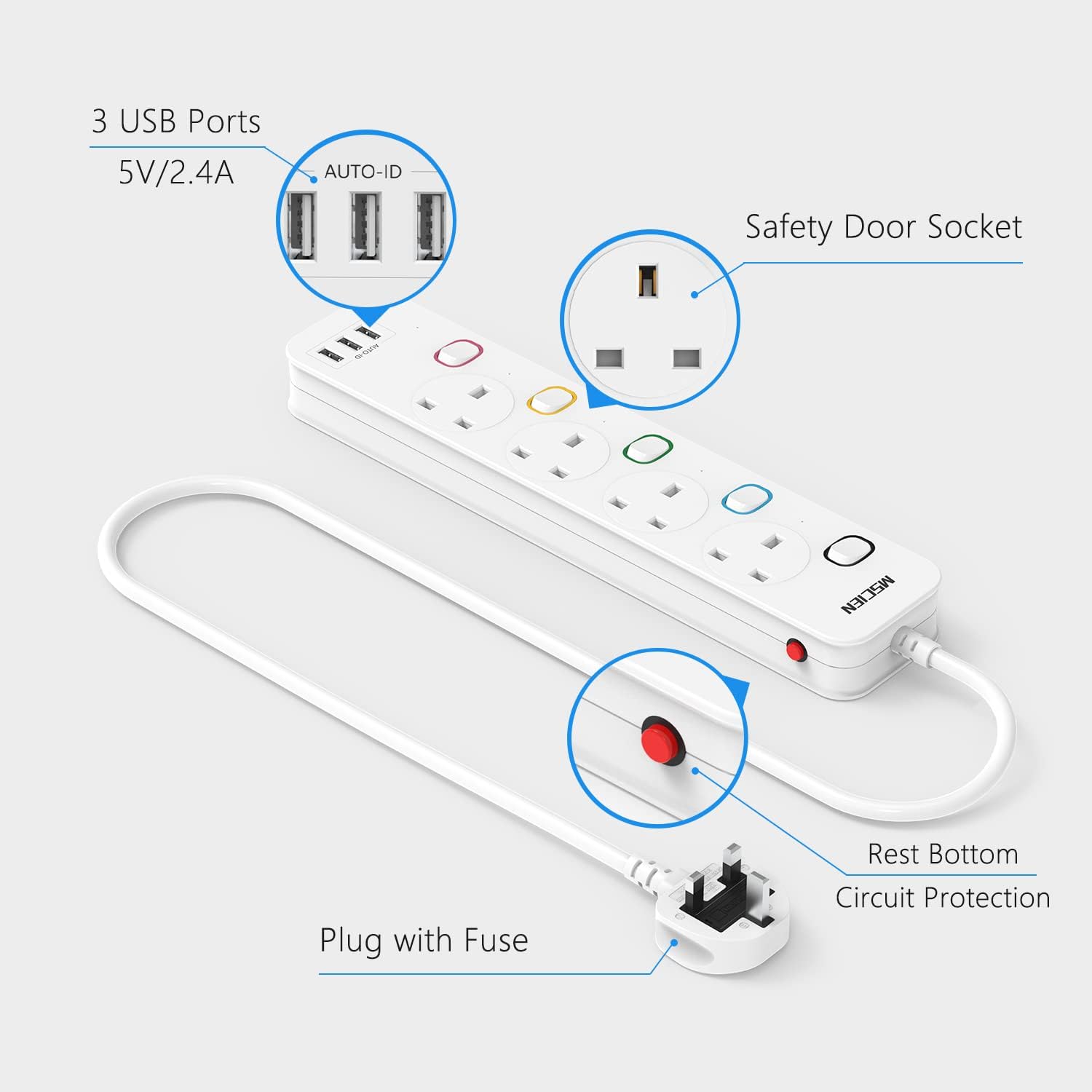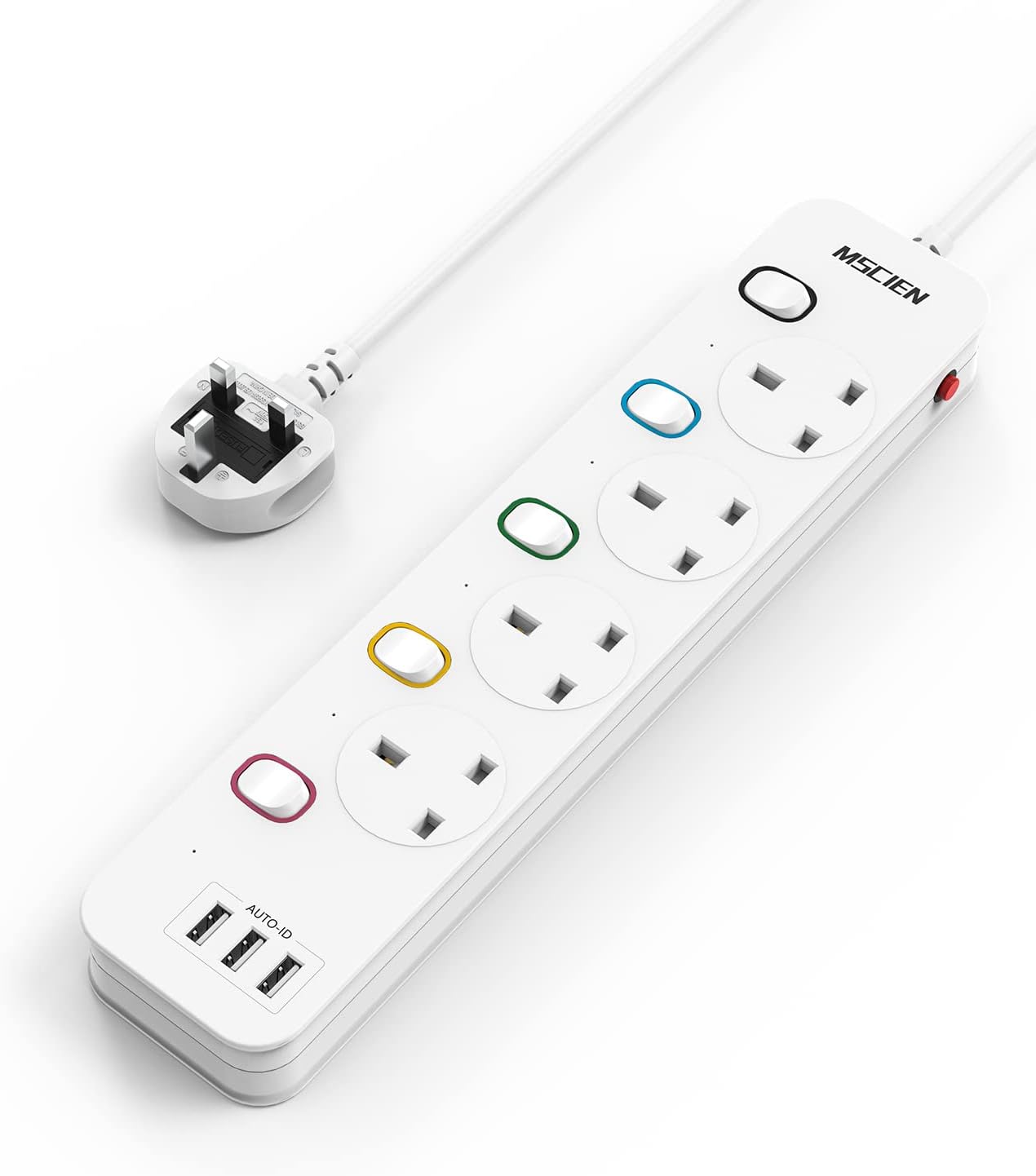 Mscien 3M Extension Lead with USB Slots, 4 Way 3 USB Extension Socket with Individual Switches Mountable Overload Protection Power Strips with 3Metre Extension cable 3250W