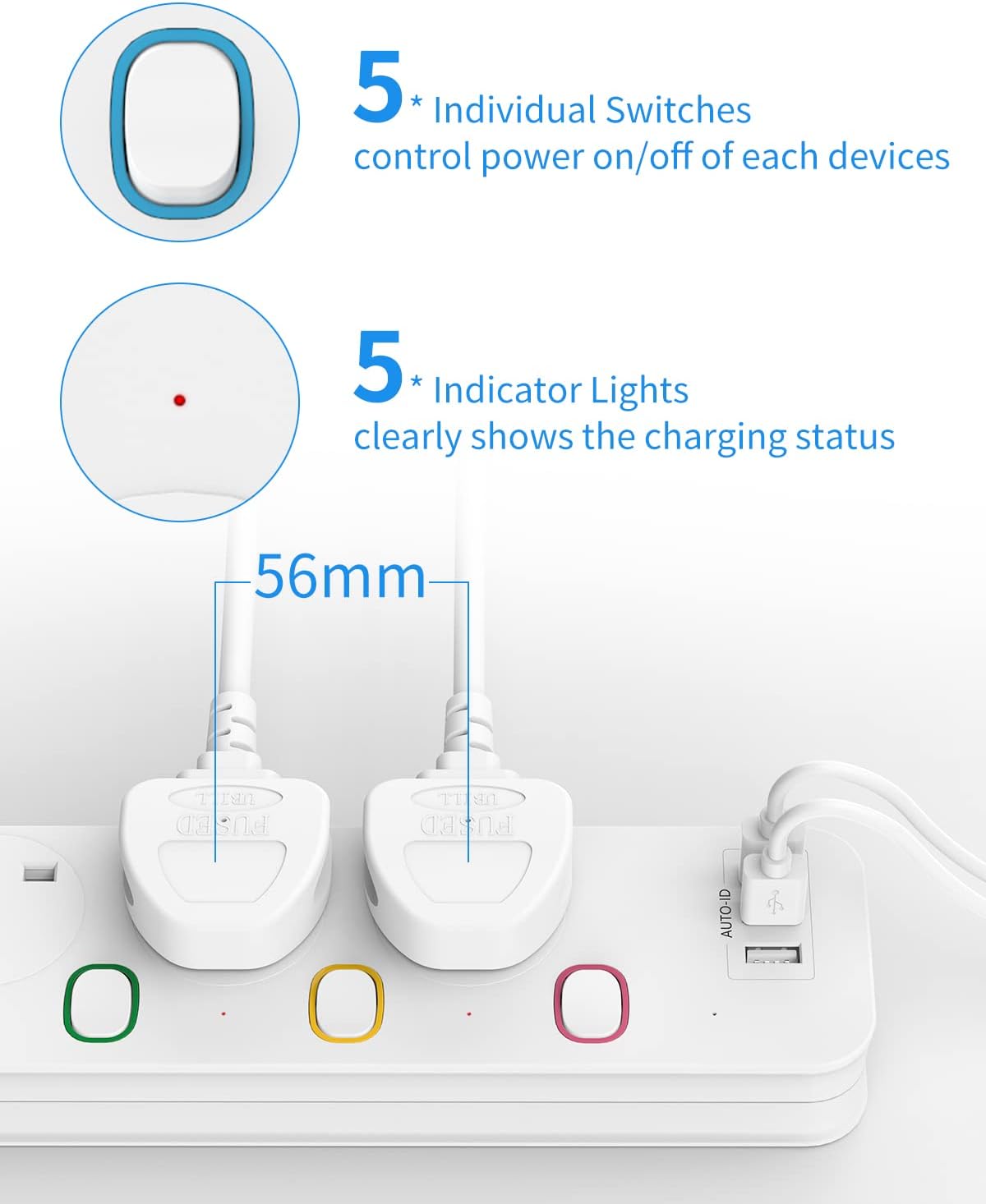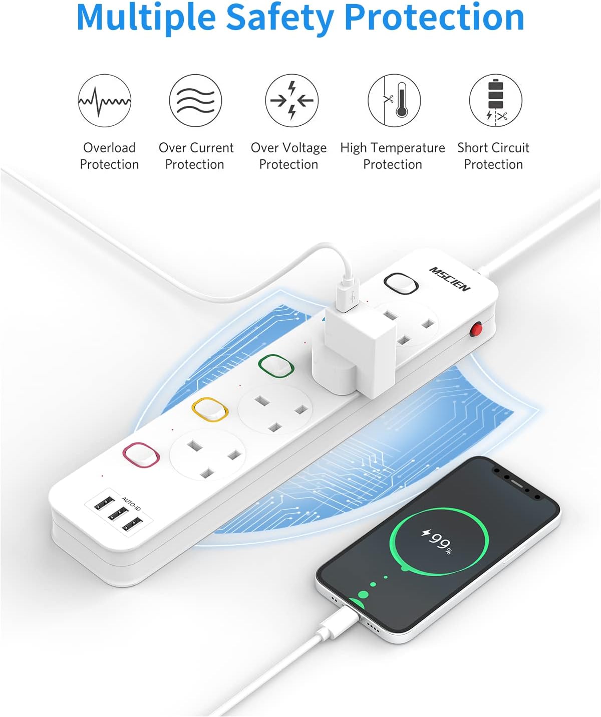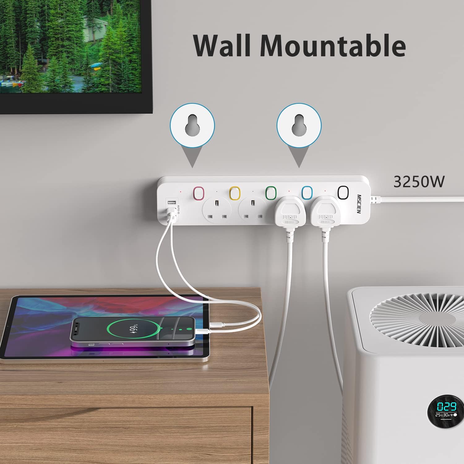 Mscien 3M Extension Lead with USB Slots, 4 Way 3 USB Extension Socket with Individual Switches Mountable Overload Protection Power Strips with 3Metre Extension cable 3250W