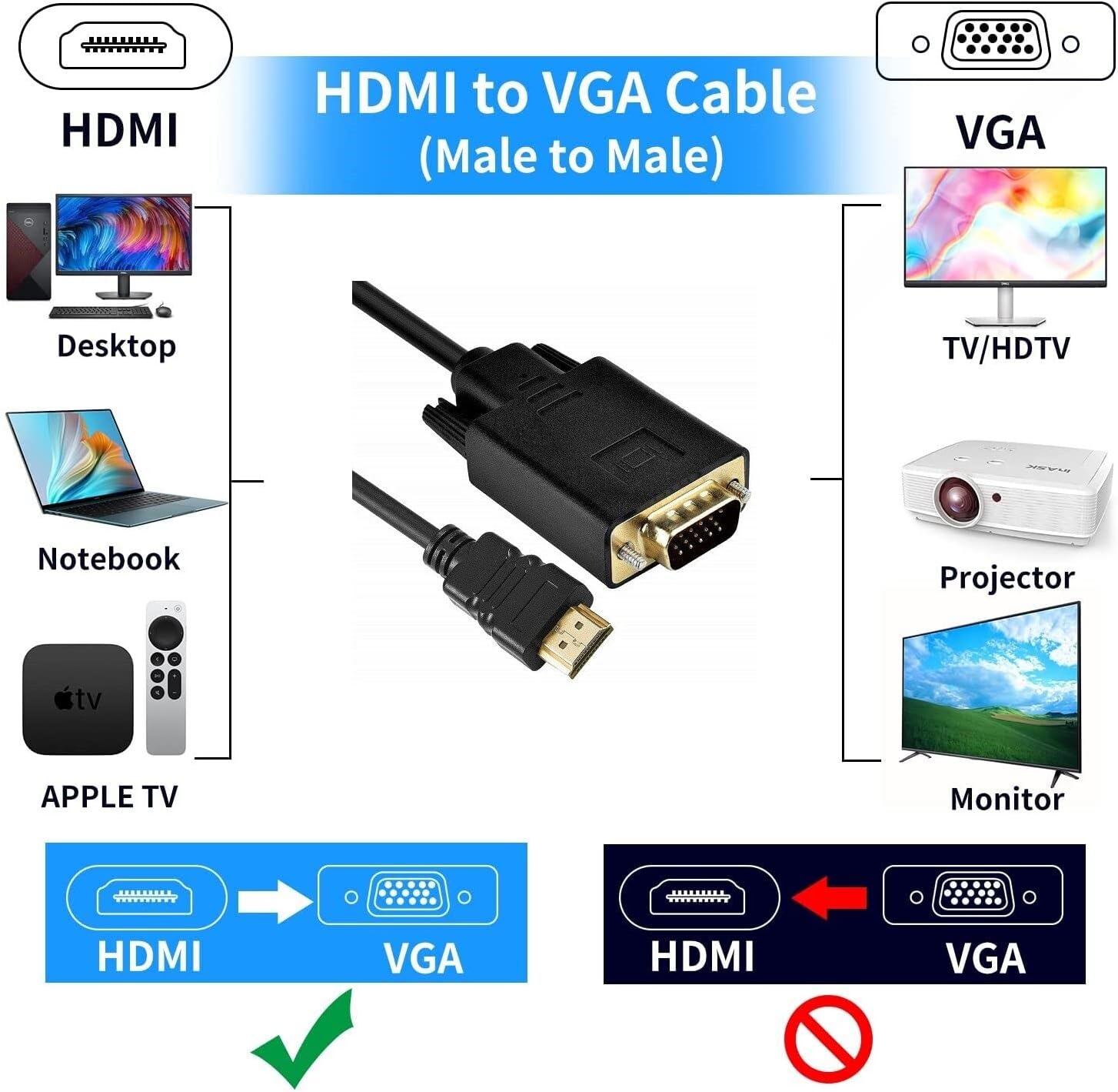 Multibao HDMI to VGA Cable, 1080P Gold plated Built-in IC Chip HDMI Male to VGA Male Adapter for PC HDTV Monitor 2M