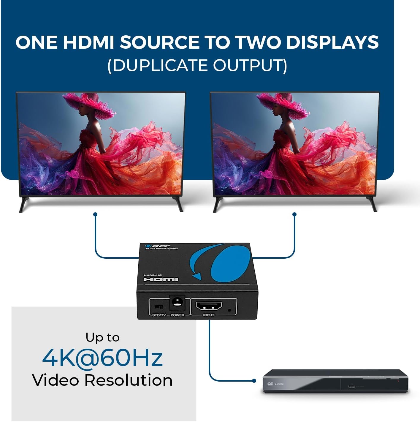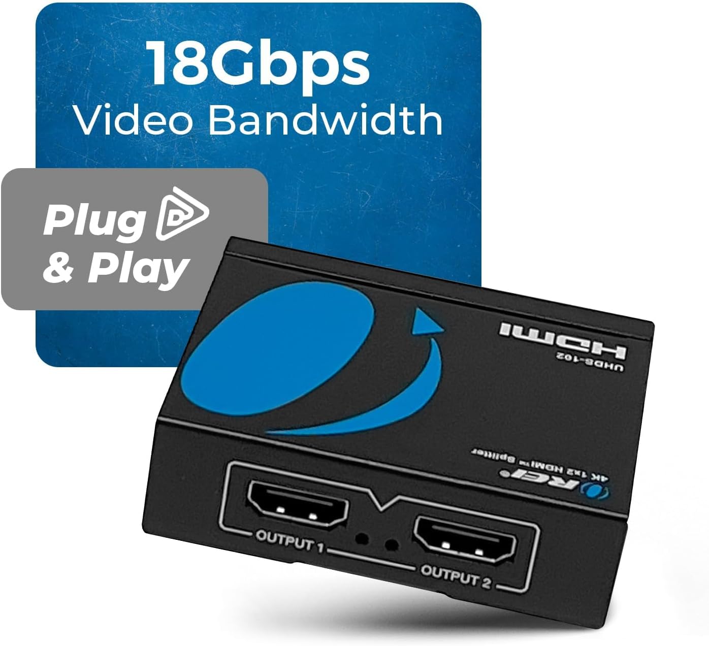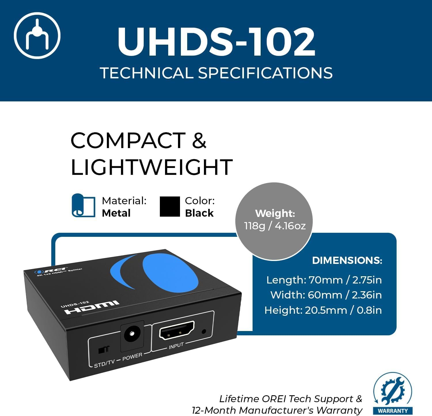 OREI UltraHD 4K @ 60 Hz 1 X 2 HDMI Splitter 1 in 2 Out 2 Port 2: 8-Bit – HDMI 2.0, HDCP 2.0, 18 Gbps, EDID, Duplicate/Mirror 4K Screens – UHDS-102