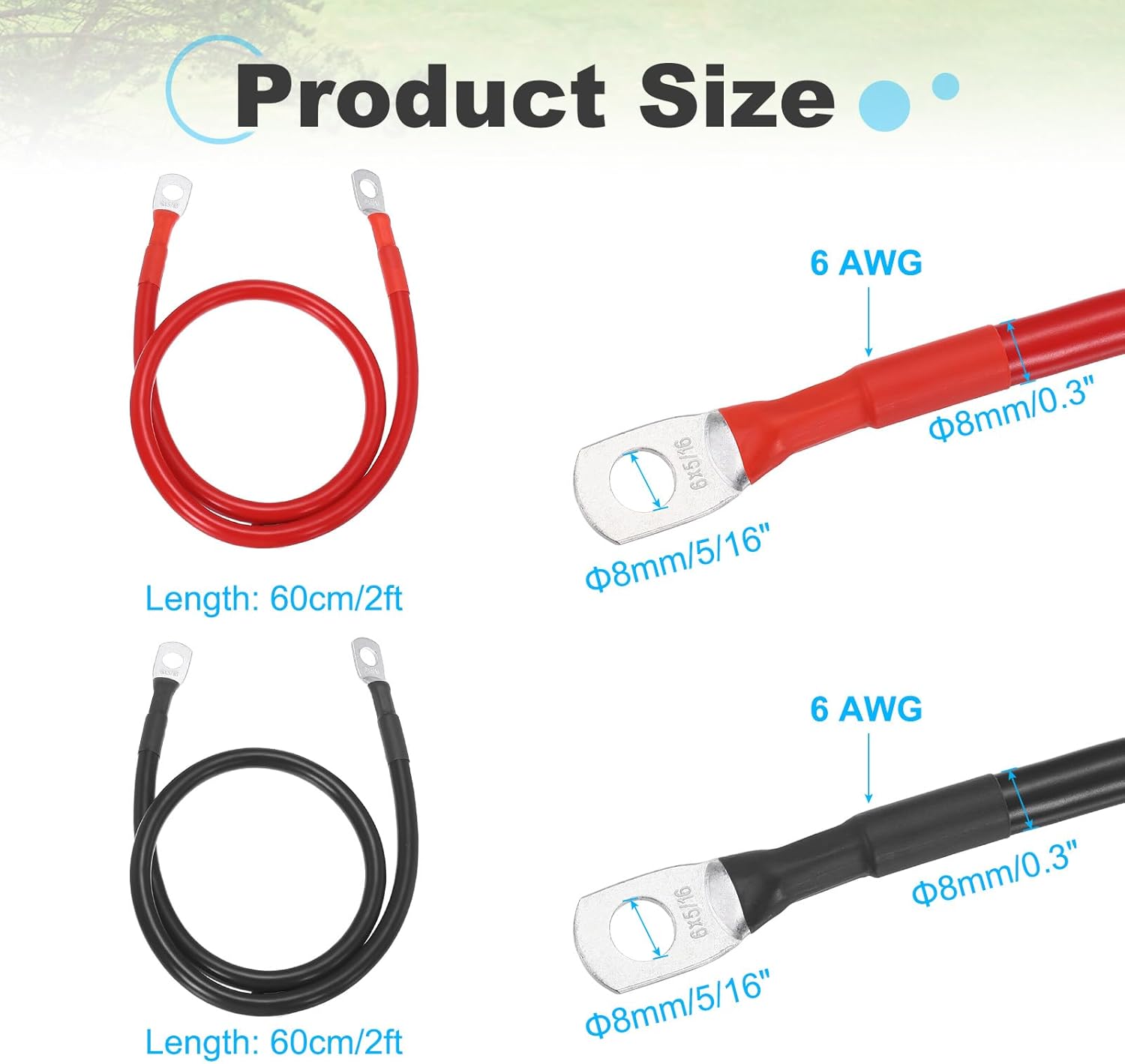 sourcing map 2PCS 6 AWG Battery Cable, 2ft Pure Copper Battery Inverter Cables with 5/16″ Ring Terminals for Marine Solar Boat Car RV, Red Black