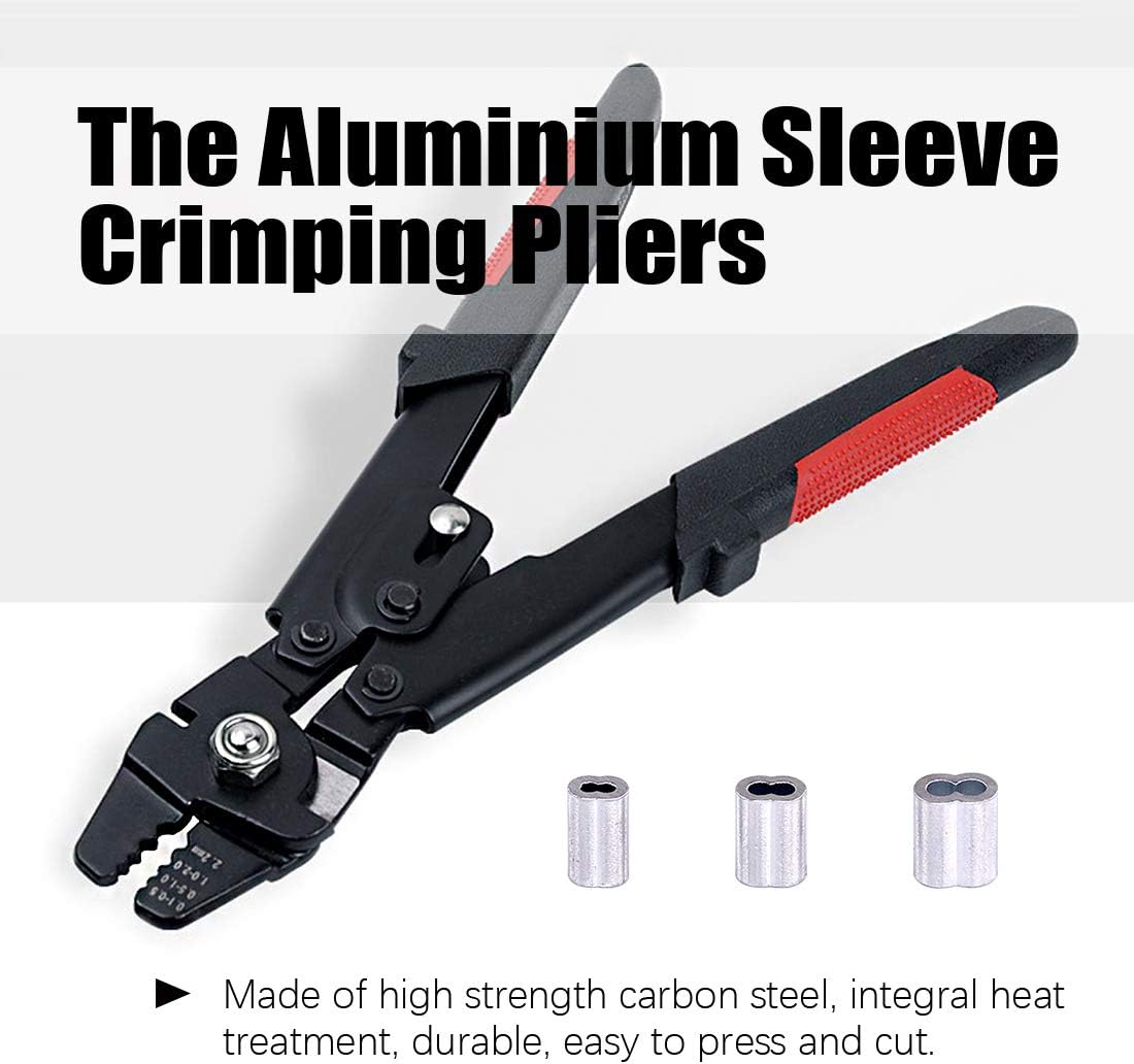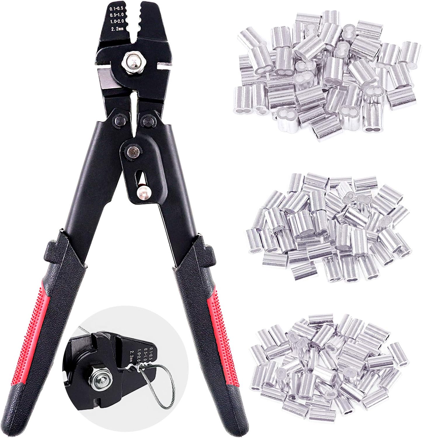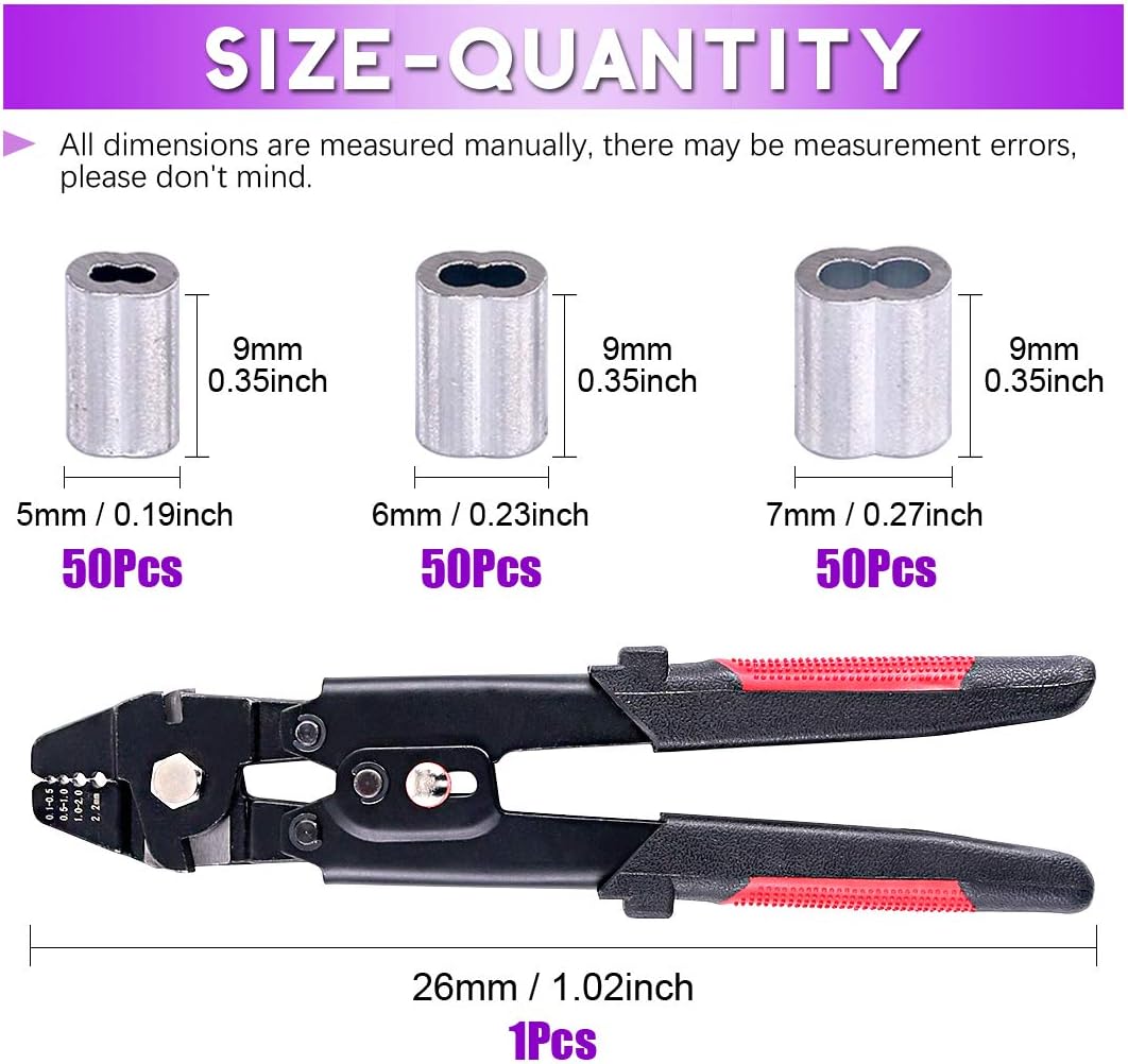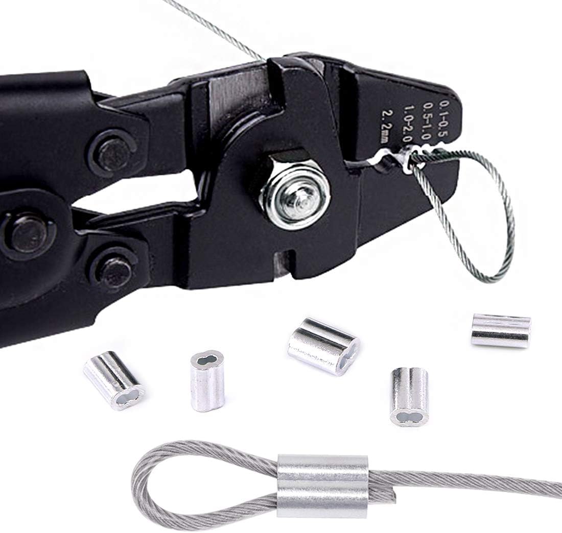 Swpeet Profession Up to 2.2mm Wire Rope Crimping Tool Wire Rope Swager Crimpers Fishing Crimping Tool with 150Pcs 3 Size Aluminum Double Barrel Ferrule Crimping Loop Sleeve Kit,Black