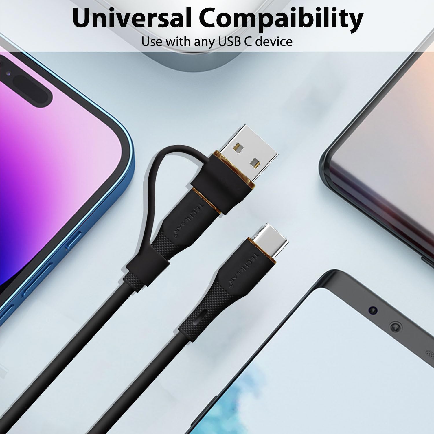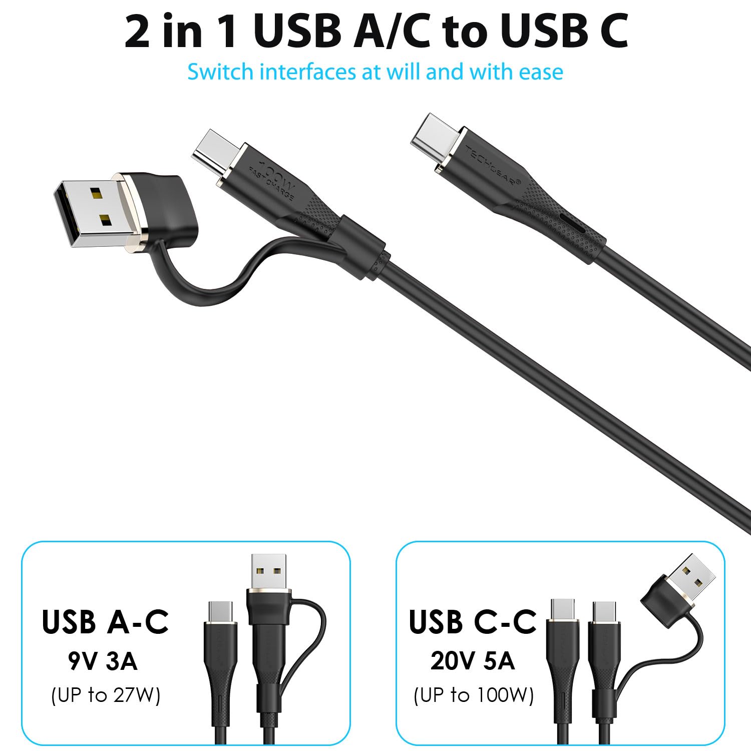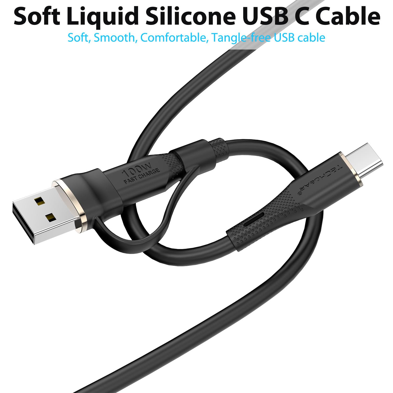TECHGEAR 2in1 100W USB A/C to USB C SOFT SILICONE Charger Cable Fast Charging 5A Tangle Free, Compatible with MacBook Pro/Air, iPad A16 Air/Pro 2024, iPhone 17 16, Galaxy S25 S24, PS5, Switch (3M)