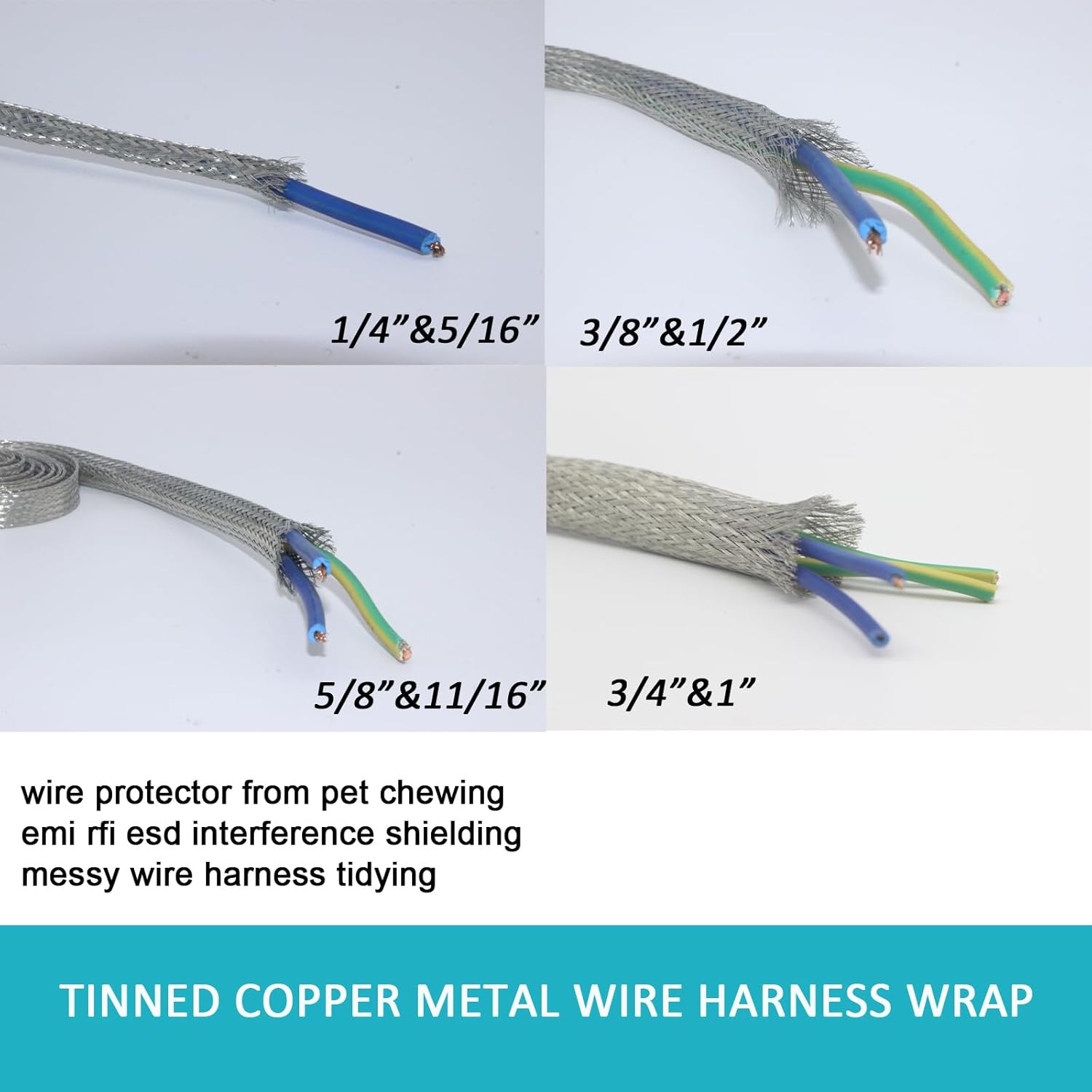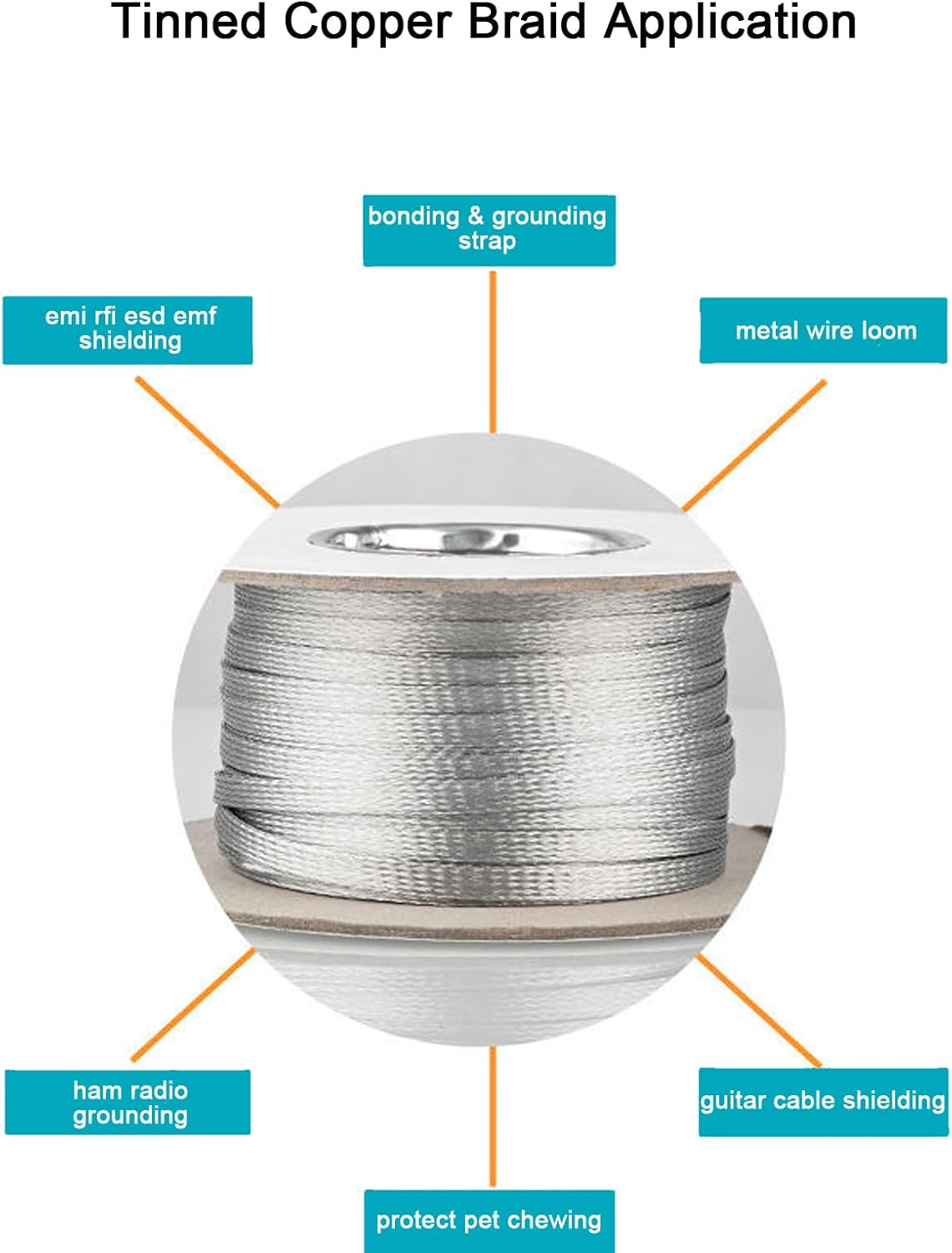 Tinned Copper Braid Cable Wire Shielding Sleeve EMI RFI ESD Protection Metal Sheathing Grounding Strap Mesh Flat Tubular Expandable 1/4″ W(0.16″ ID)-9FT