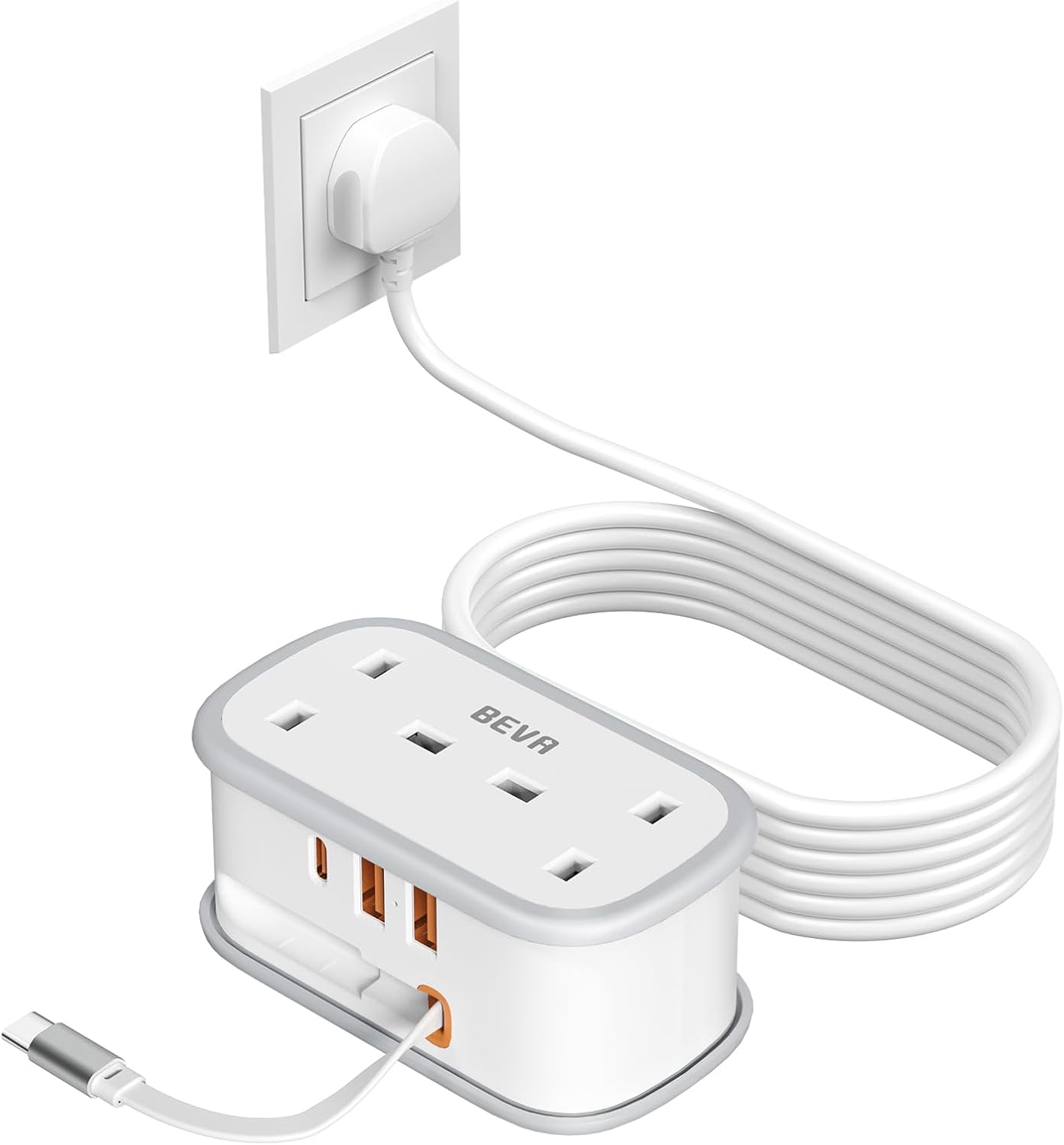Travel Extension Lead, BEVA Power Strip with Retractable USB C Cable, 2 Way Power Socket with 3 USB Ports (1 USB C), 1.5M Extension Cable Cords for Cruise Travel Hotel Home Office Camping – White