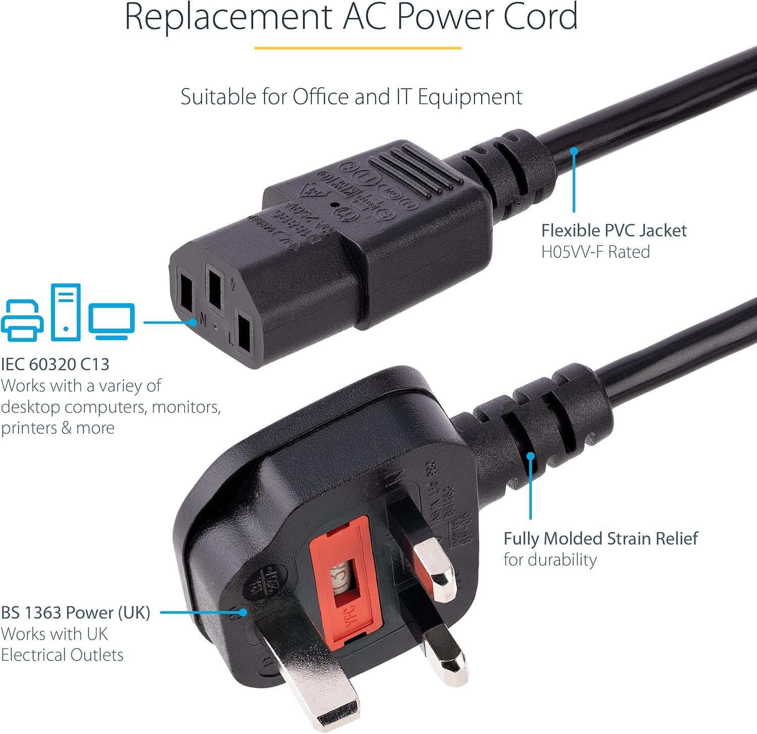 UK 3 Pin Kettle Lead Power Cable IEC C13 to BS1363 Plug 1.5M 5FT 6FT AC Mains Power Cord 13A 250V for PC Computer Monitor TV Printer Laptop Power Supply Black (1, 1M)