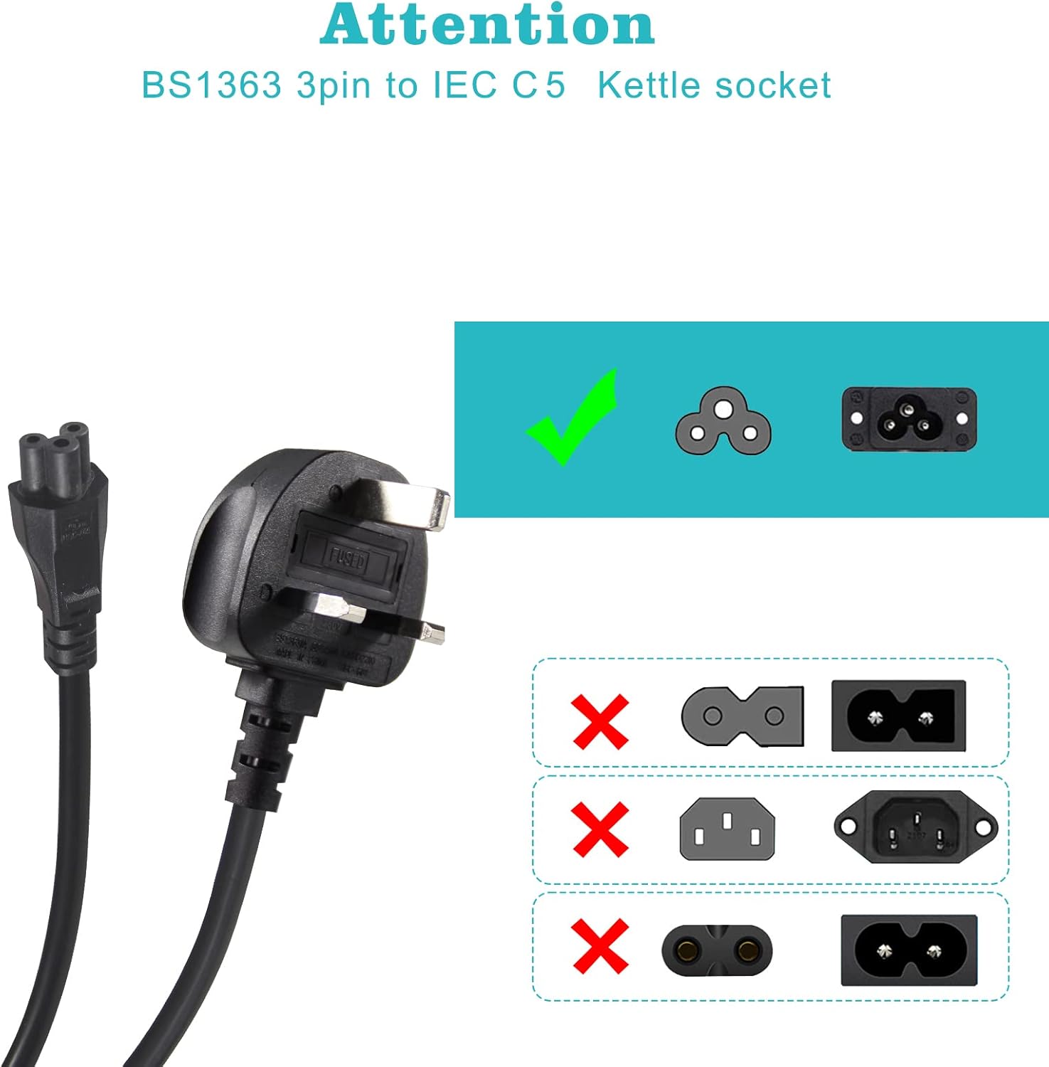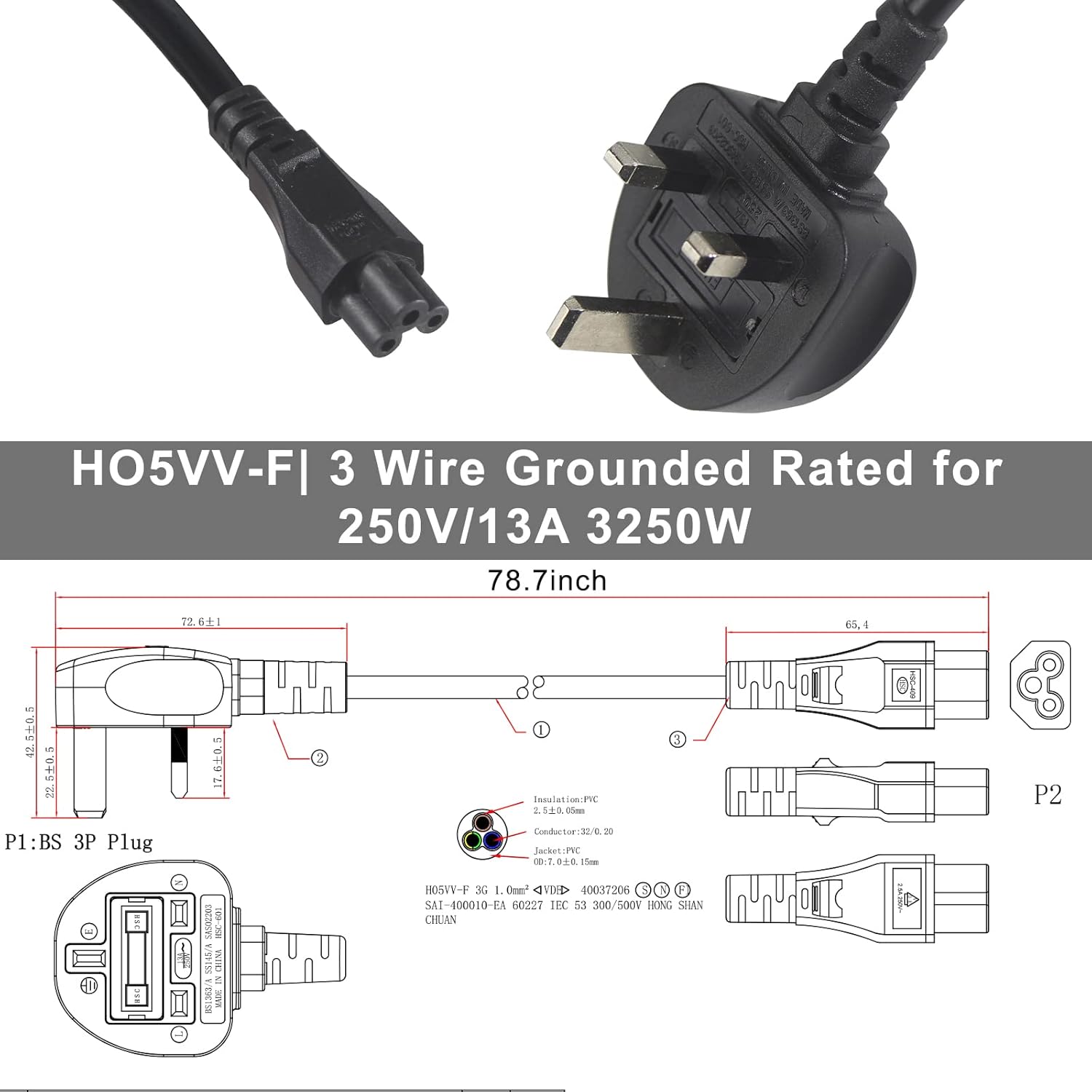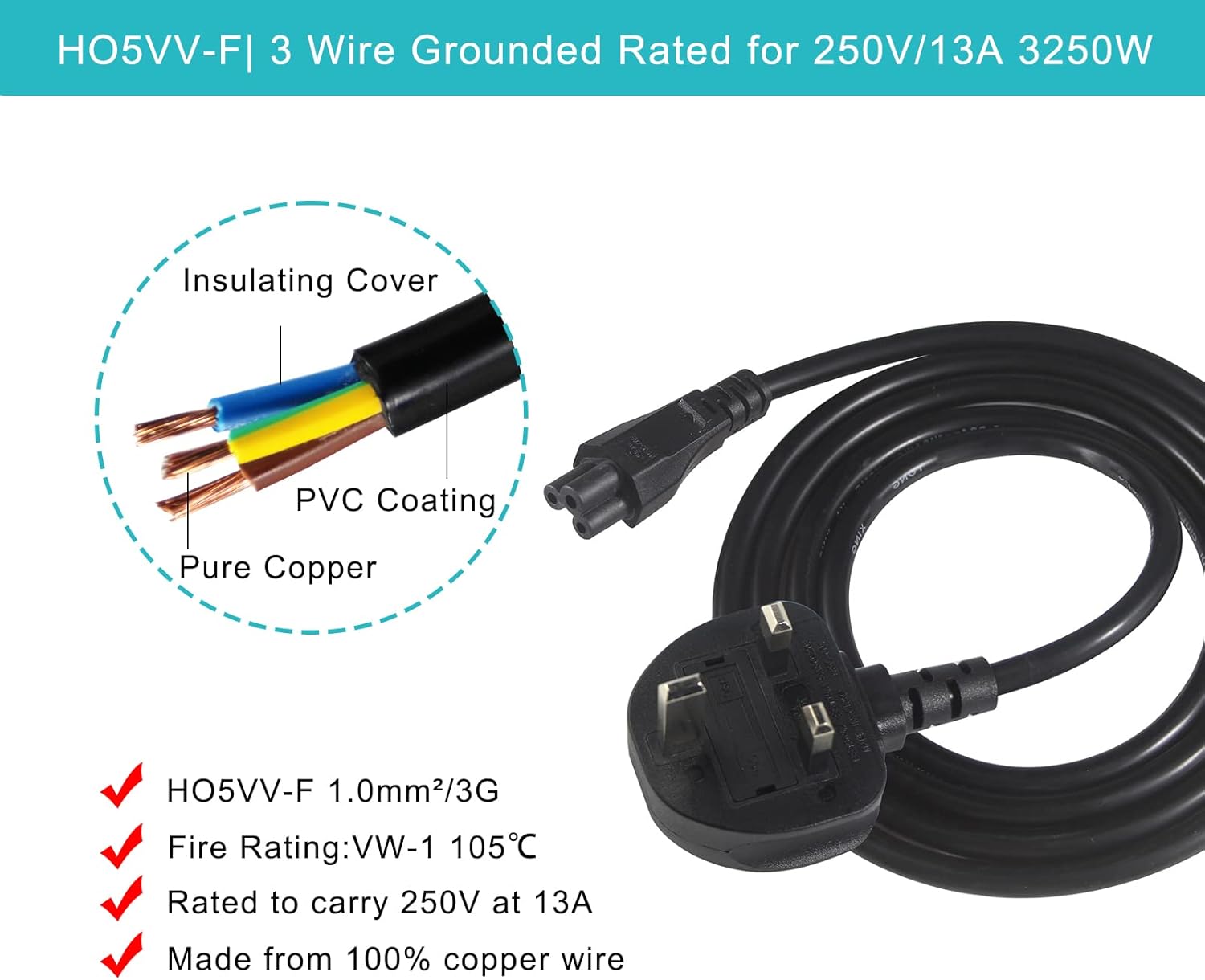 UK Laptop Power Cable 2M, BS 1363 to C5 Cloverleaf, 13A 250V, Heavy Duty 16AWG 1.0mm2, Replacement Cord for Laptops and Printers