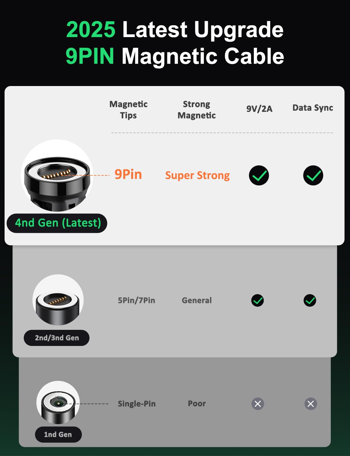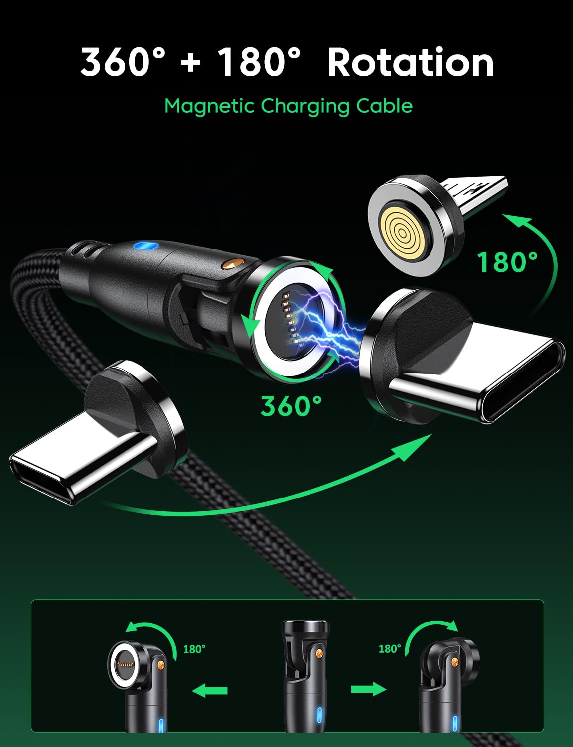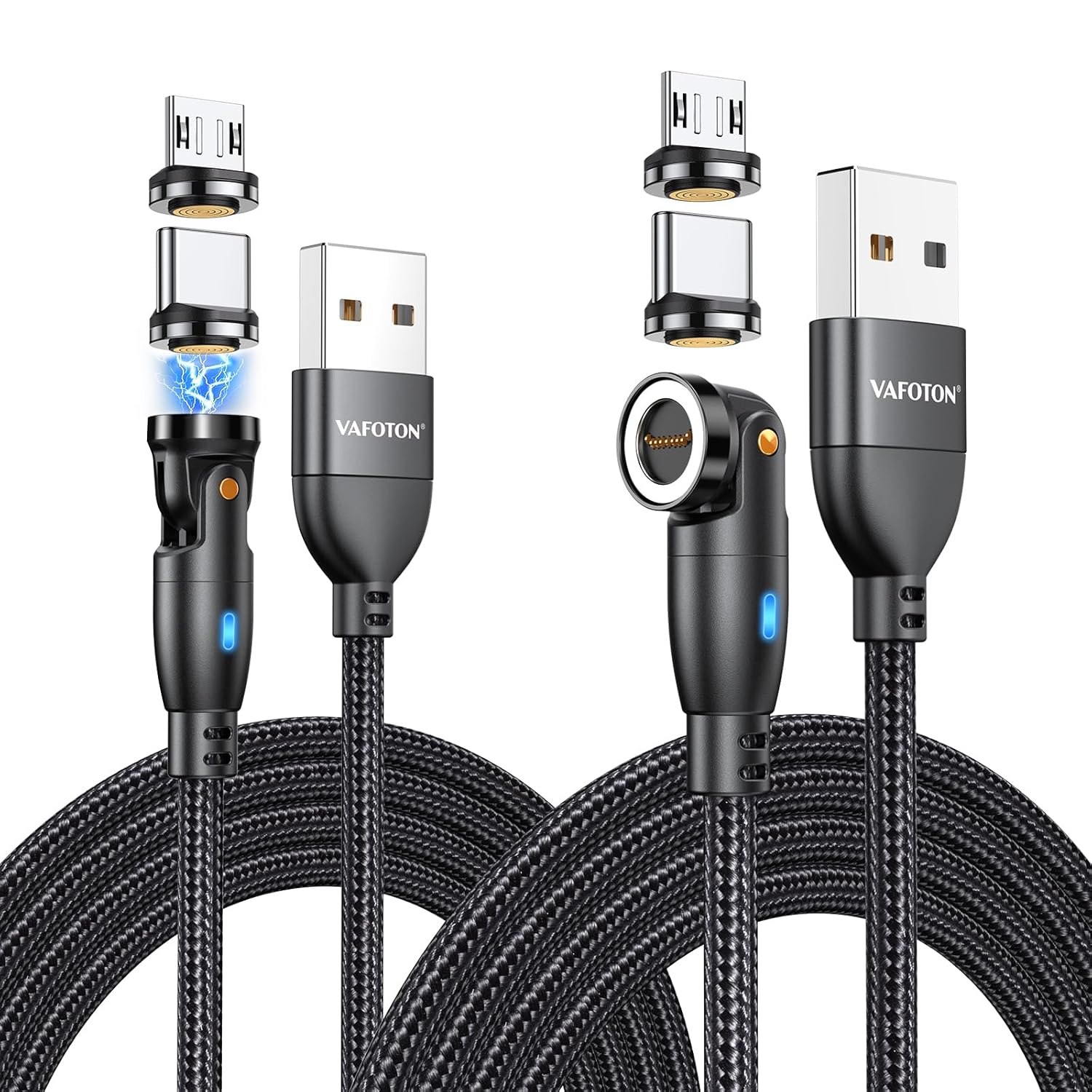 VAFOTON 9Pin Magnetic Charging Cable, 18W Magnetic Phone Charger Cable 2PCS (2M+1M), 540° Rotation & Data Transfer for Type C, Micro USB
