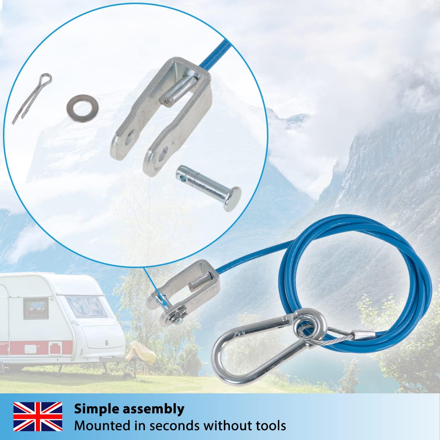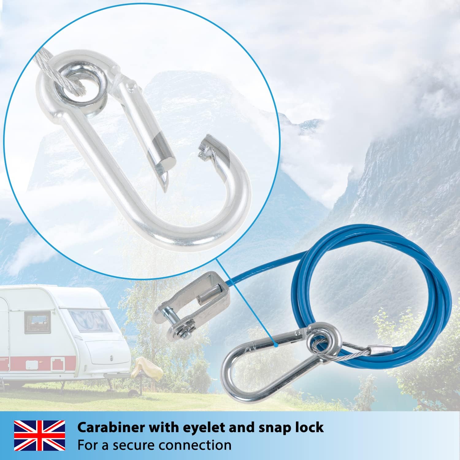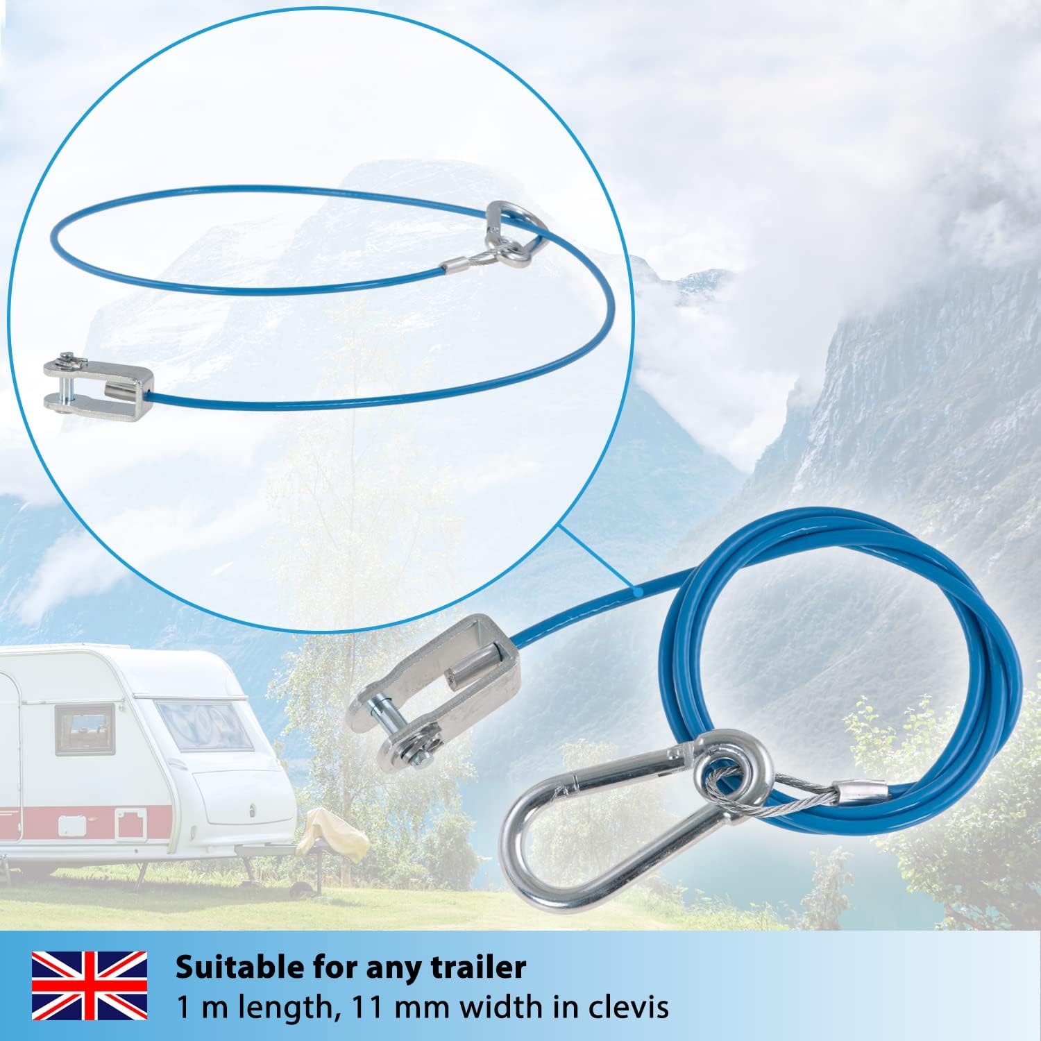 valonic breakaway cable for trailers and caravans, 1m, blue, with carabiner, 250kg breaking load, breakaway cable with fork head (shackle), ripcord