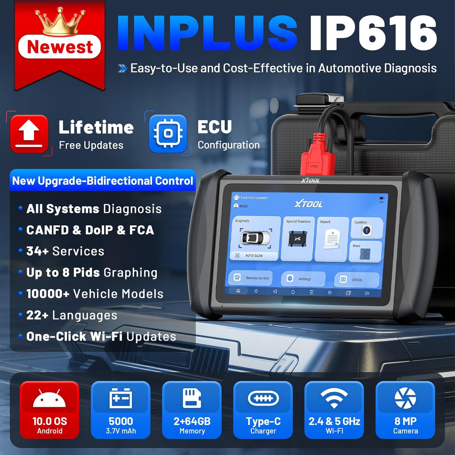 XTOOL IP616 Car Diagnostic Tool: Bidirectional OBD2 Scanner with All System, ECU Configuration, 34+Resets-Oil/ABS/EPB//DPF/Throttle/SAS/TPMS, Injector Coding, FCA/CANFD/DoIP, Lifetime Update